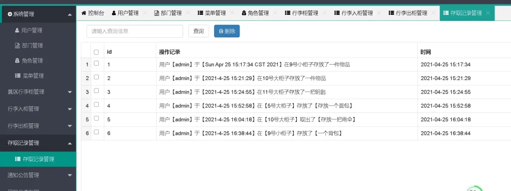 - 提供历史寄存记录查询功能,支持按日期、柜号、物品名称筛选。