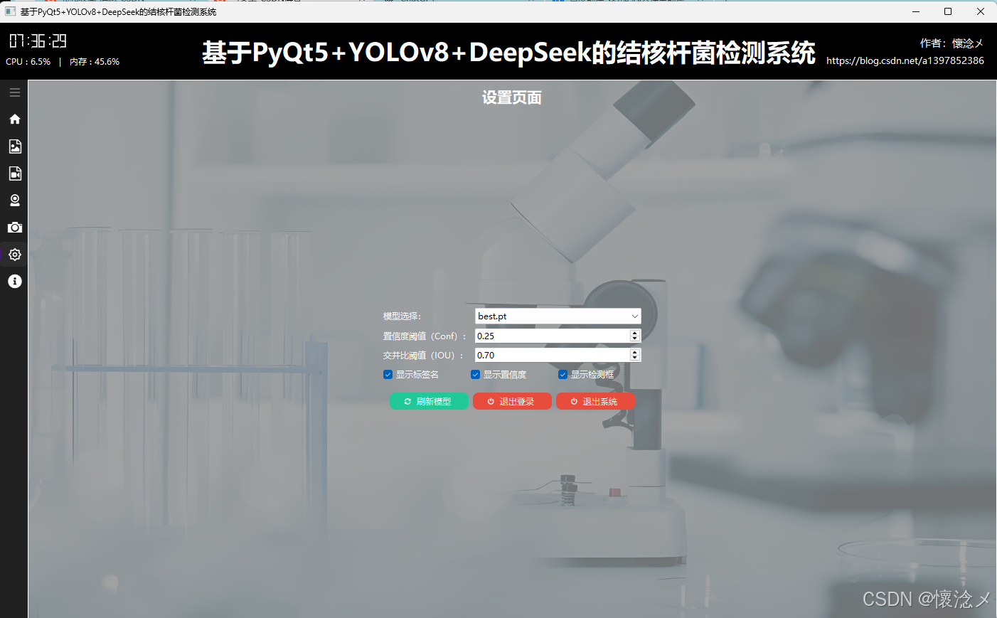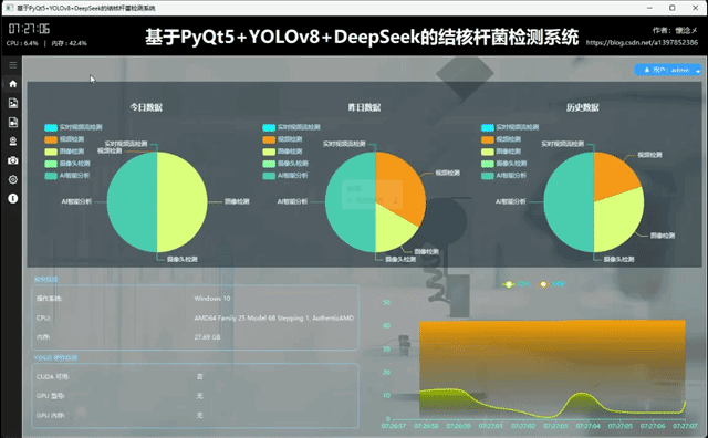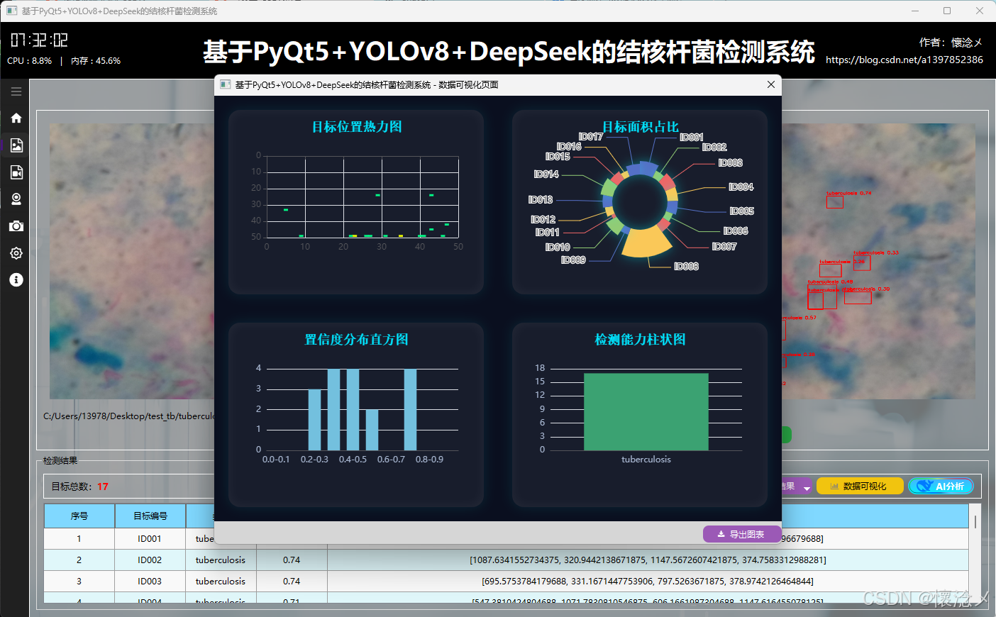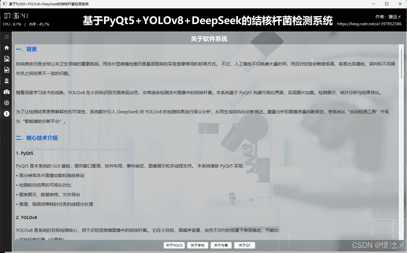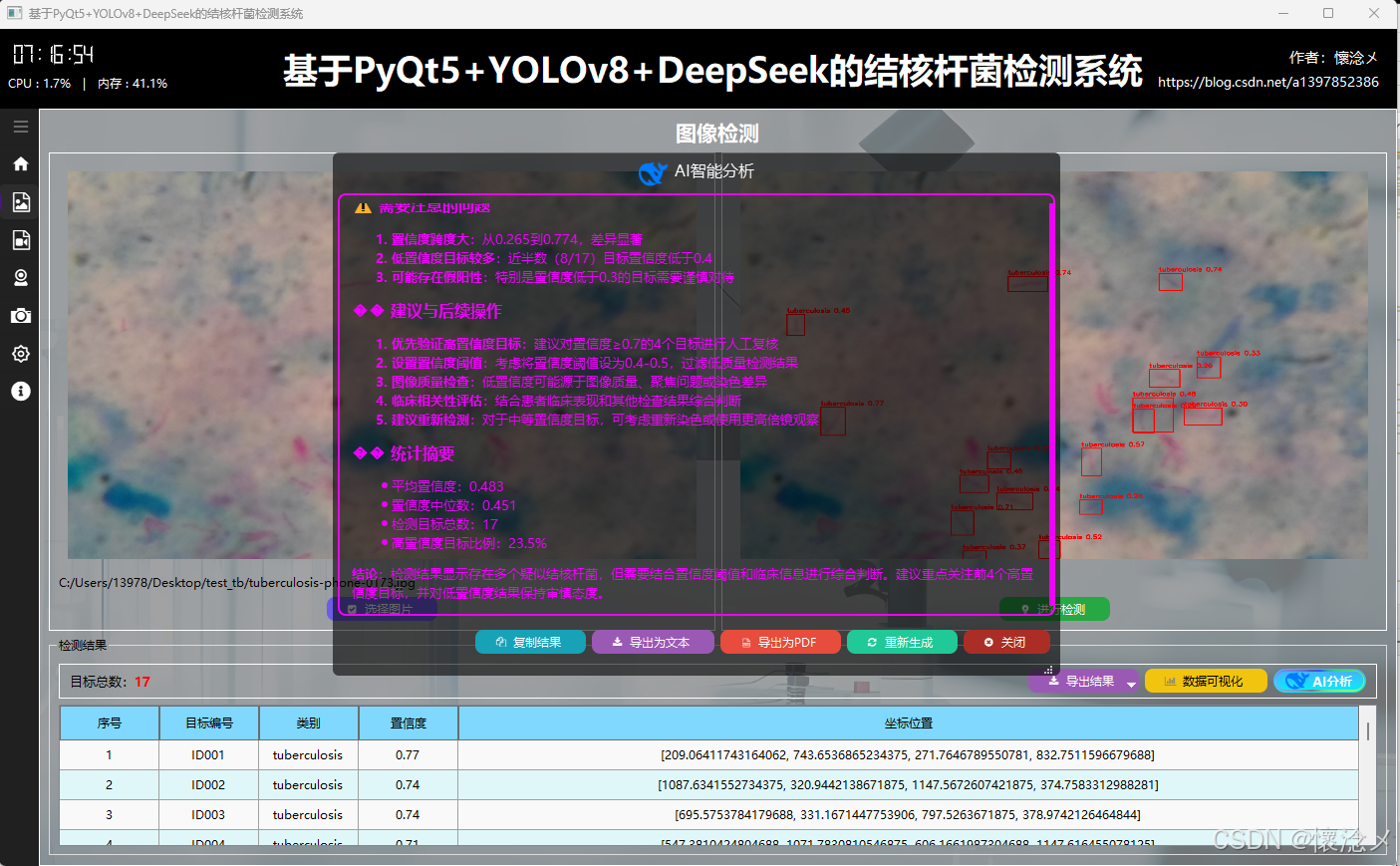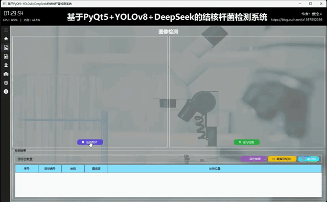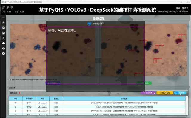 本次给大家介绍了我使用PyQt5+YOLOv8+DeepSeek开发的结核杆菌检测系统,本系统功能强大,支持多种数据源输入,包含多种用户交互按钮以及模式,内置数据可视化方案、大模型AI加持,是您学习、工作使用的不错选择!