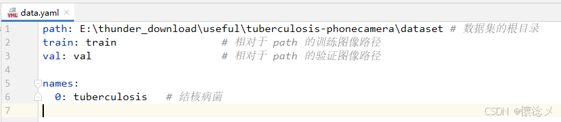 数据集准备好之后就可以开始模型训练了,我们首先准备一个训练的配置文件,比如说是data.yaml