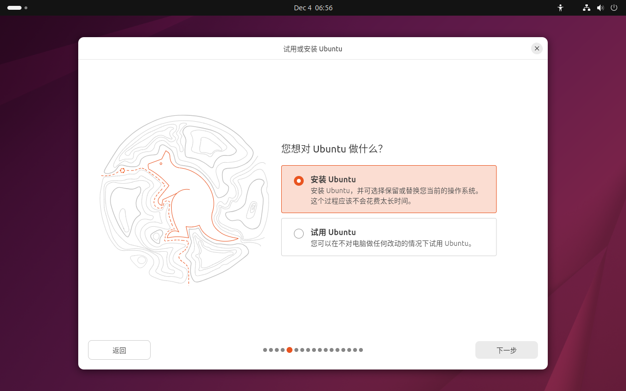 这里选择你是要安装还是试用,如果选试用等于是没有把系统安装到硬盘但是可以测试一些兼容性