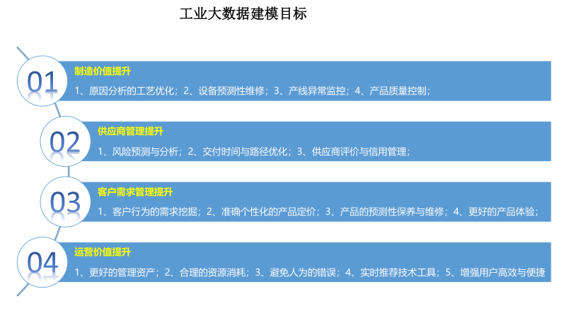 工业大数据建模聚焦于提升制造价值、优化供应商管理、精准客户需求管理及提升运营价值。通过运用先进的机器学习算法,如深度神经网络(DNN),对生产过程、设备状态及产线数据进行深度挖掘与分析,自动揭示工艺流程与数据流之间的内在逻辑联系。该方案支持异常检测、设备预测性维修、产线监控及产品质量控制等功能,有效提升生产过程的稳定性和产品质量。建模过程中,注重数据的采集、预处理及模型训练,通过聚类分析、关联分析等手段,不断优化模型参数,提高预测的准确性和实时性。此外,该方案还强化了客户需求管理,通过分析客户行为,实现个性化产品定价与预测性维护,进一步增强客户满意度和市场竞争力,推动企业持续创新与发展。