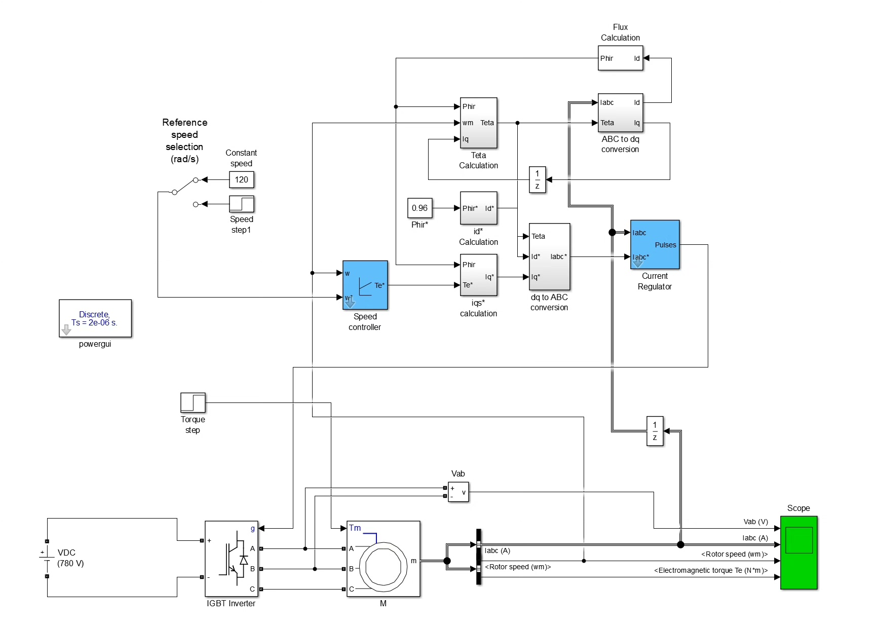 电机模块我们可以调用SIMULINK自带的异步电机模型,它已经内置好了电机的各种参数和运行方程。坐标变换模块就是刚刚咱们说的Clark变换和Park变换等实现的地方。