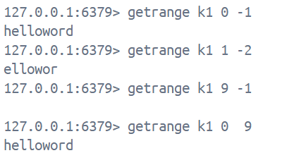 按照指定范围截取字符串, 类似于Java中的substring, 不同的是在Redis中支持负数下标, 即用负数表示倒数, -1表示len-1, 倒数第一个, 超过范围的偏移量还会根据string长度去调整, 同时需要特别注意的是, Redis中的范围是前闭后闭的, 单位是字节