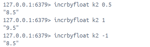 3. incrbyfloat 用来操作小数, 可进行小数之间的相加与相减, 具体值自己设定, 返回值是相加/相减后的值, 注意事项和特性与上面一致