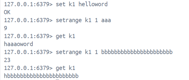 offset 是偏移量, 表示要从第几个字节开始进行替换, 其中替换的范围是value的长度, 返回值是修改后字符串的长度, 当key对应的value不存在的时候, Redis会自动补充一个字节的字符串用'\x00'表示