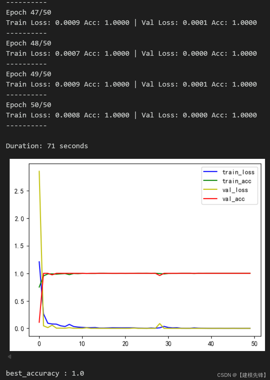 50个epoch,准确率100%,用深度残差收缩网络(DRSN)分类效果显著,训练初期损失快速下降,模型准确率逐步提升,验证集曲线平稳,说明网络收敛良好,无明显过拟合,能够从故障信号特征中提取出对模型识别重要的特征,效果明显!