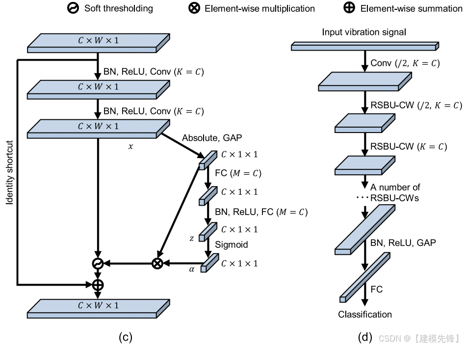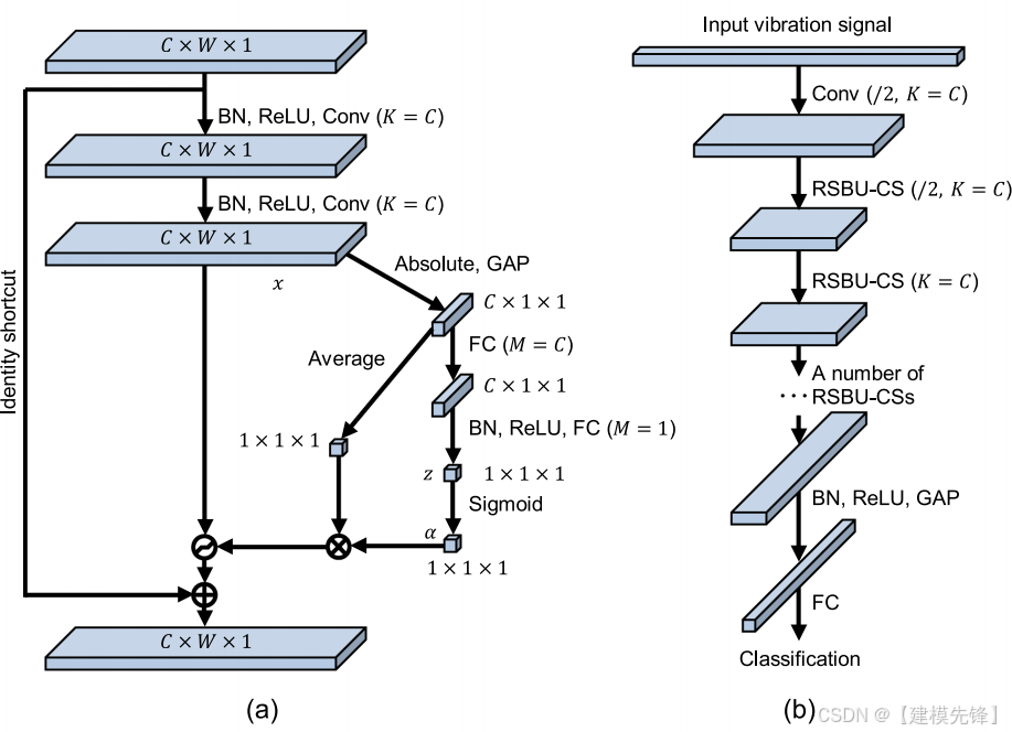 DRSN-CS是ResNet网络的一个变种,使用软阈值化来消除噪声相关的特征。软阈值化作为一个非线性转换层被插入结构单元中。同时,该阈值可以在结构单元中学习得到。该结构单元命名为(RSBU-CS,即Residual shrinkage building unit)。不同于RBU(Residual building unit,ResNet网络中的基本单元),RSBU-CS有一个特殊的模块用于估计阈值。在该模块中,GAP被用于特征图x的绝对值中,来得到一维向量。随后,该一维向量会传入两层全连接层来获得尺度参数。在两层全连接层后会使用一个sigmoid函数,此时尺度参数会被转换为(0,1)中的某个值。该尺度参数随后会与特征图|x|的平均值相乘来得到阈值。这一步是考虑到阈值不仅需要是正数,而且不能太大,否则软阈值化后的特征将全为0.RSBU-CS和DRSN-CS的网络结构如下图所示: