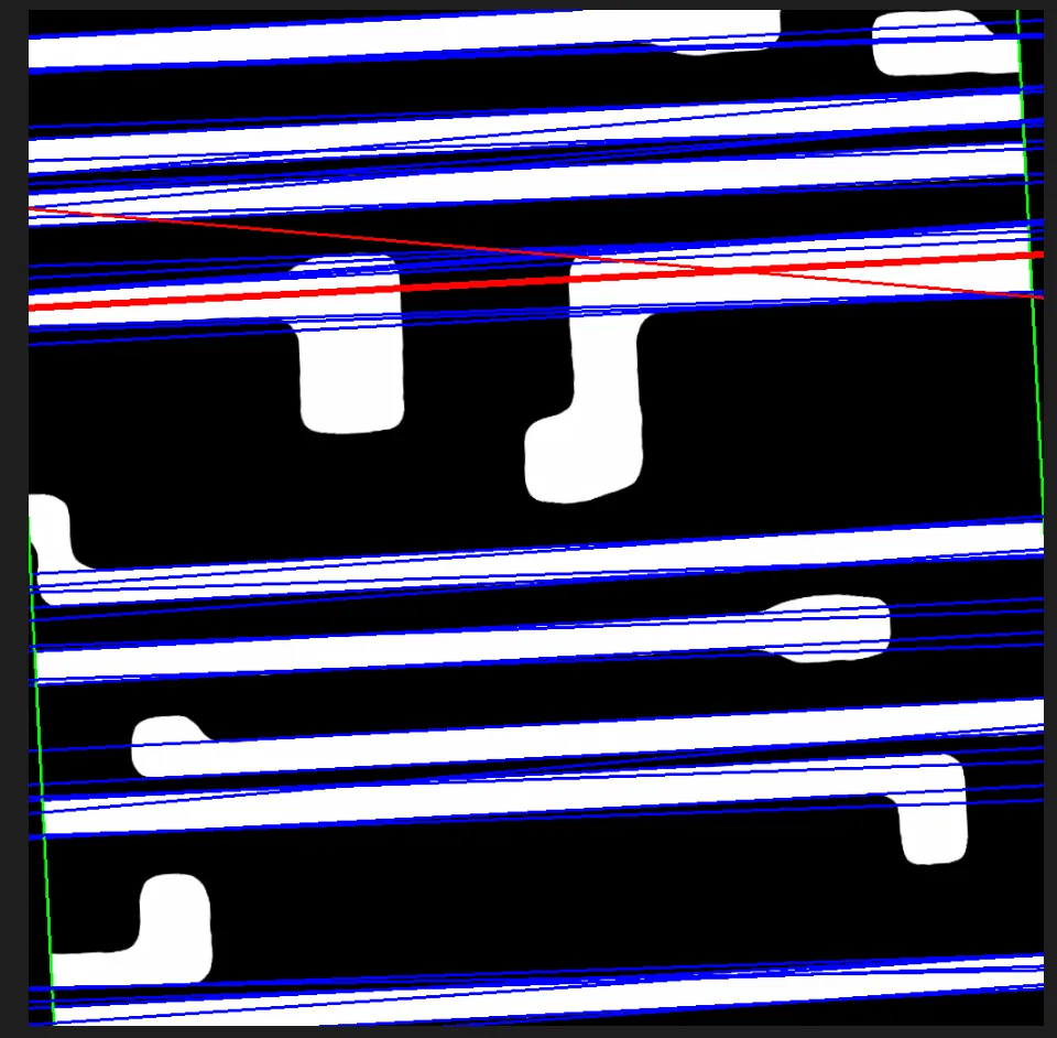 过滤掉绿色的线,仅剩下蓝色的线,对所有蓝色线的theta取均值,可以看作这张图象的倾斜角度(红色较粗的线)