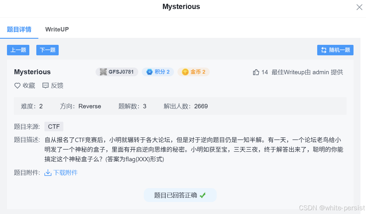 在 CTF 逆向领域,Windows 对话框程序是常见题型之一。这类程序通常通过对话框与用户交互,核心逻辑封装在回调函数中,Flag 生成往往依赖特定输入条件。本文以攻防世界 reverse 题目「Mysterious」为例,从逆向分析到 Flag 推导,全程还原解题思路,并提炼同类题目的通用解法。