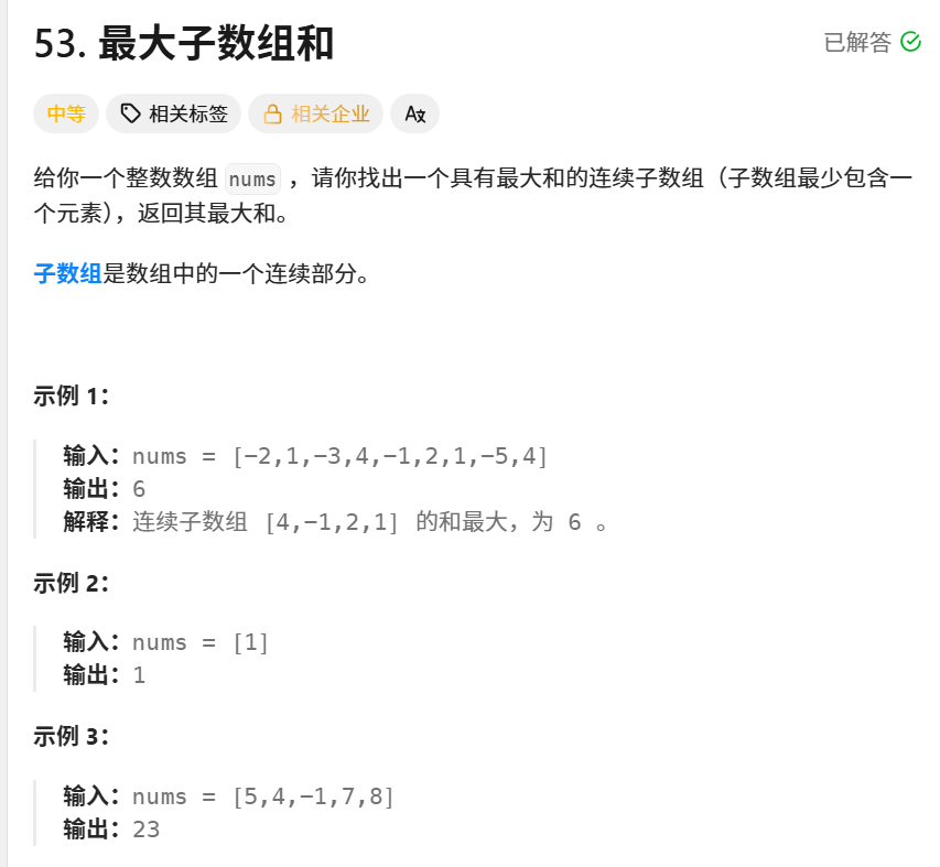 运用动态规划的思想,设动态规划列表 dp ,dp[i] 代表以元素 nums[i] 为结尾的连续子数组最大和。从第二个元素开始遍历原数组,如果dp[i-1]是大于0的,就说明当前元素加上之前的最大字数组和会更大,故dp[i]=dp[i-1]+nums[i],如果dp[i-1]是小与0的,说明此时以nums[i]结尾的最大字数组为dp[i]=nums[i],最后遍历dp数组就会的解。