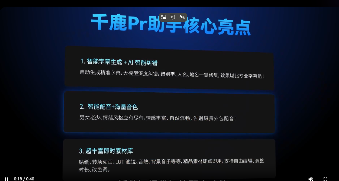 - 解决方案:千鹿PR助手的字幕识别功能能够根据视频中的语音自动生成字幕,支持中文、英文、日语、韩语四种语言的字幕翻译。文稿匹配功能则可以帮助你将已有的脚本与语音完美对接,省去一切手动调节的麻烦。