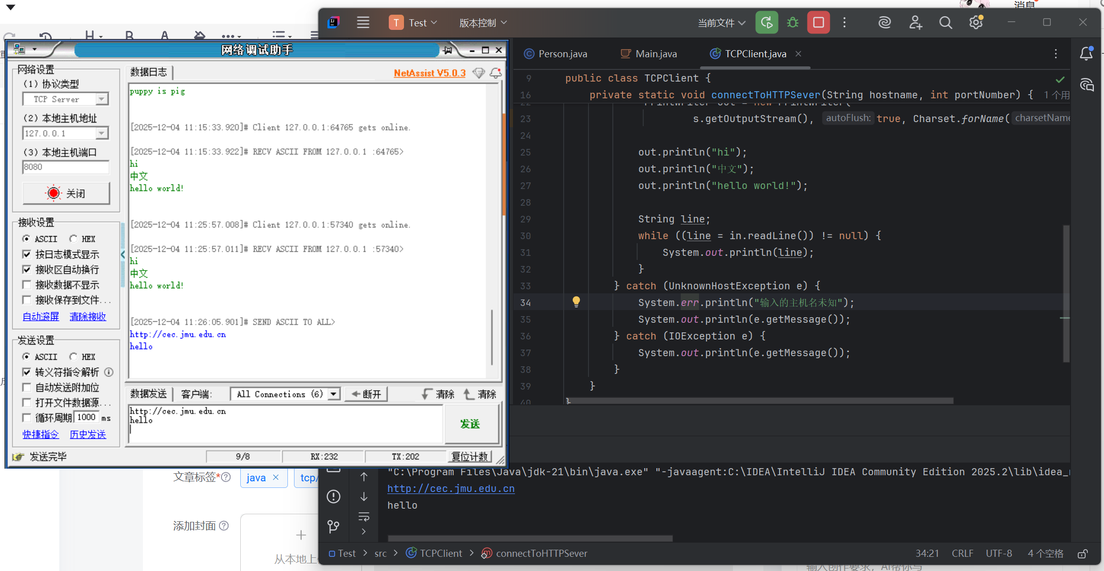 - 本地8080端口是服务端,正在运行(网络调试助手);
