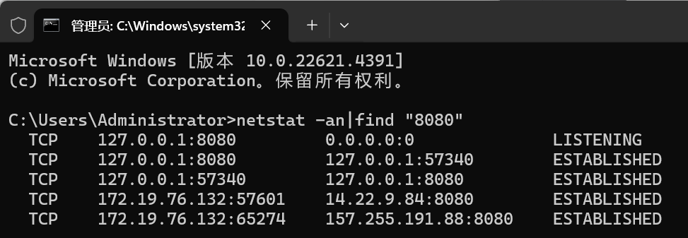 2)输入命令:C:\Users\Administrator>netstat -an|find "8080"
