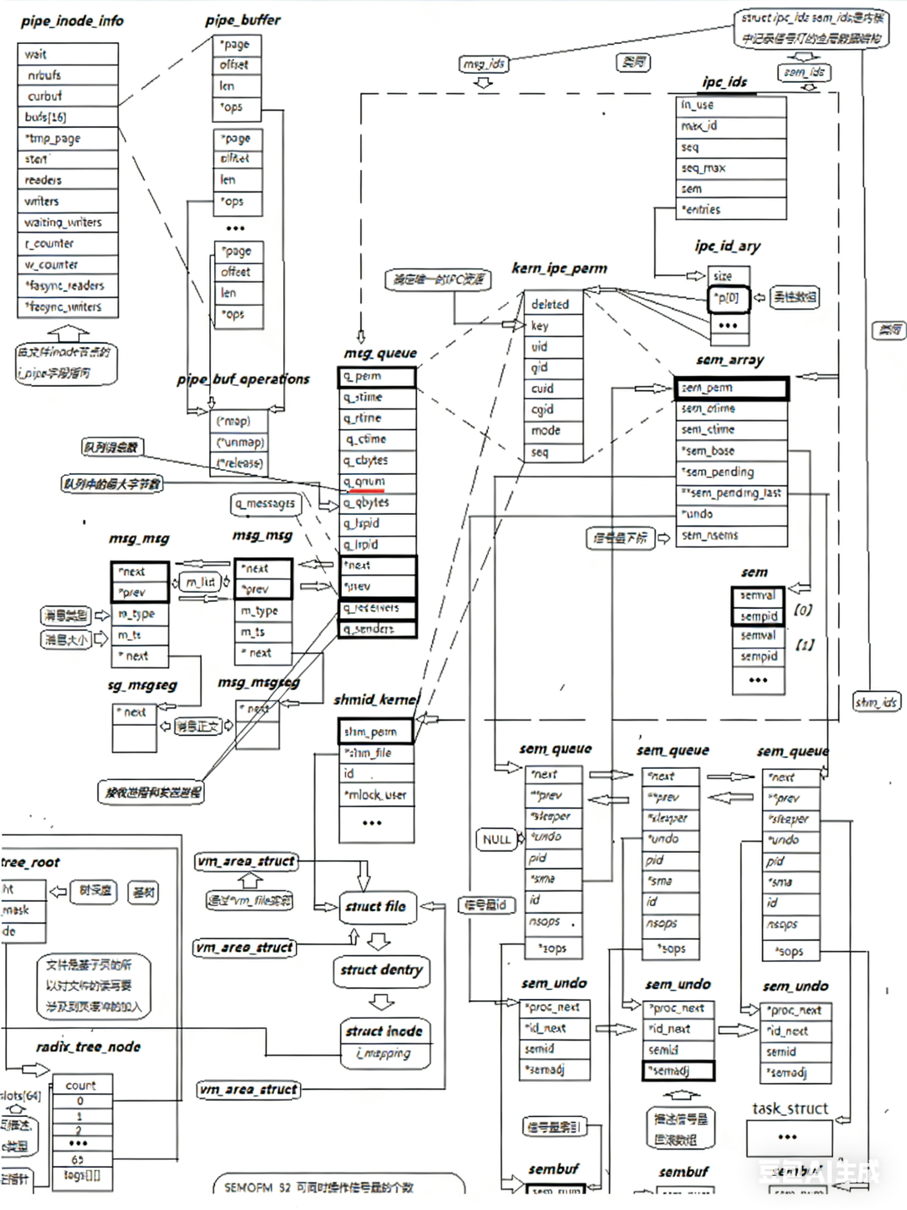 以上的IPC相关结构体第一个成员变量都是ipc_perm,且由于结构体的地址和结构体第一个变量的地址是数值上一样的(都是取首地址),所以只要指向了ipc_perm就相当于指向了对应的IPC通信(要使用具体的通信方式成员变量就对指针强制类型转换即可)