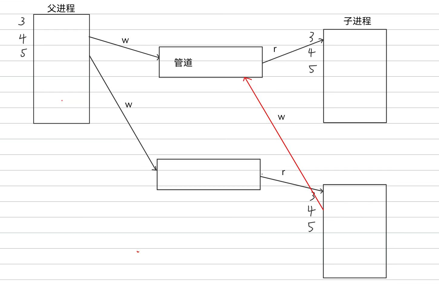 这是因为父进程继承给子进程的fd有三个,分别是第一个管道的写端fd,第二个管道的读端fd以及写端fd。由于我们之前只让子进程关闭新的管道写端fd,所以会多一个之前管道的写端fd