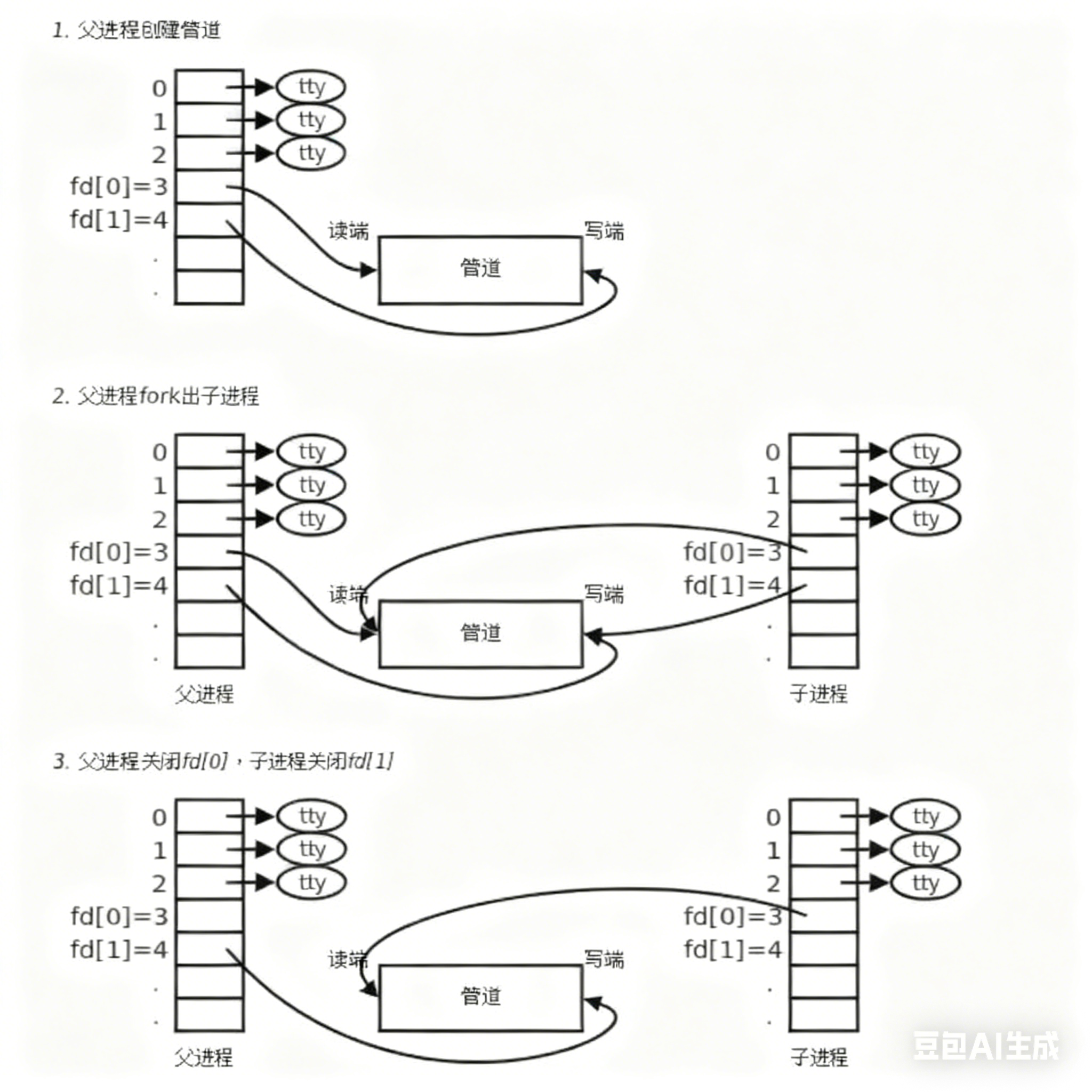 cpp#include<iostream> #include<cstdio> #include<unistd.h> #include<cstdlib> #include<sys/types.h> #include<sys/wait.h> using namespace std; int main() { //1.父进程创建管道 int pipefd[2] = {0}; int n = pipe(pipefd); if(n == -1) { perror("pipe"); exit(1); } else if(n == 0)//管道创建成功 { //2.创建子进程 pid_t id = fork(); if(id < 0) { perror("fork"); exit(1); } else if(id == 0) { //3.子进程关闭对应的fd close(pipefd[0]); //4.写入信息 string str = "subprocess"; string self = to_string(getpid()); int cnt = 1; while(1) { string message = str + ", " + self + ", " + to_string(cnt++); write(pipefd[1],message.c_str(),message.size()); sleep(1);//减缓写入速度,避免卡死 } } else { //3.父进程关闭对应的fd close(pipefd[1]); //4.读取信息 while(1) { char buff[1024]; ssize_t b = read(pipefd[0],buff,sizeof(buff)-1); if(b > 0) { buff[b] = 0; cout << "read " << buff << endl; } } pid_t rid = waitpid(id,nullptr,0); } //4.正常通信 } return 0; }总步骤: