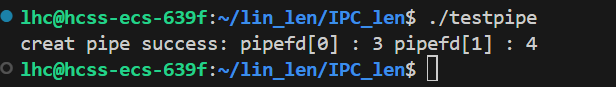 cpp#include<iostream> #include<cstdio> #include<unistd.h> #include<cstdlib> using namespace std; int main() { int pipefd[2] = {0}; int n = pipe(pipefd); if(n == -1) { perror("pipe"); exit(1); } else if(n == 0) { //创建成功 printf("creat pipe success: pipefd[0] : %d pipefd[1] : %d\n",pipefd[0],pipefd[1]); } return 0; }