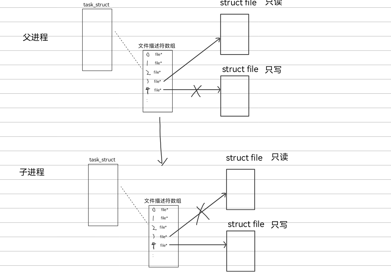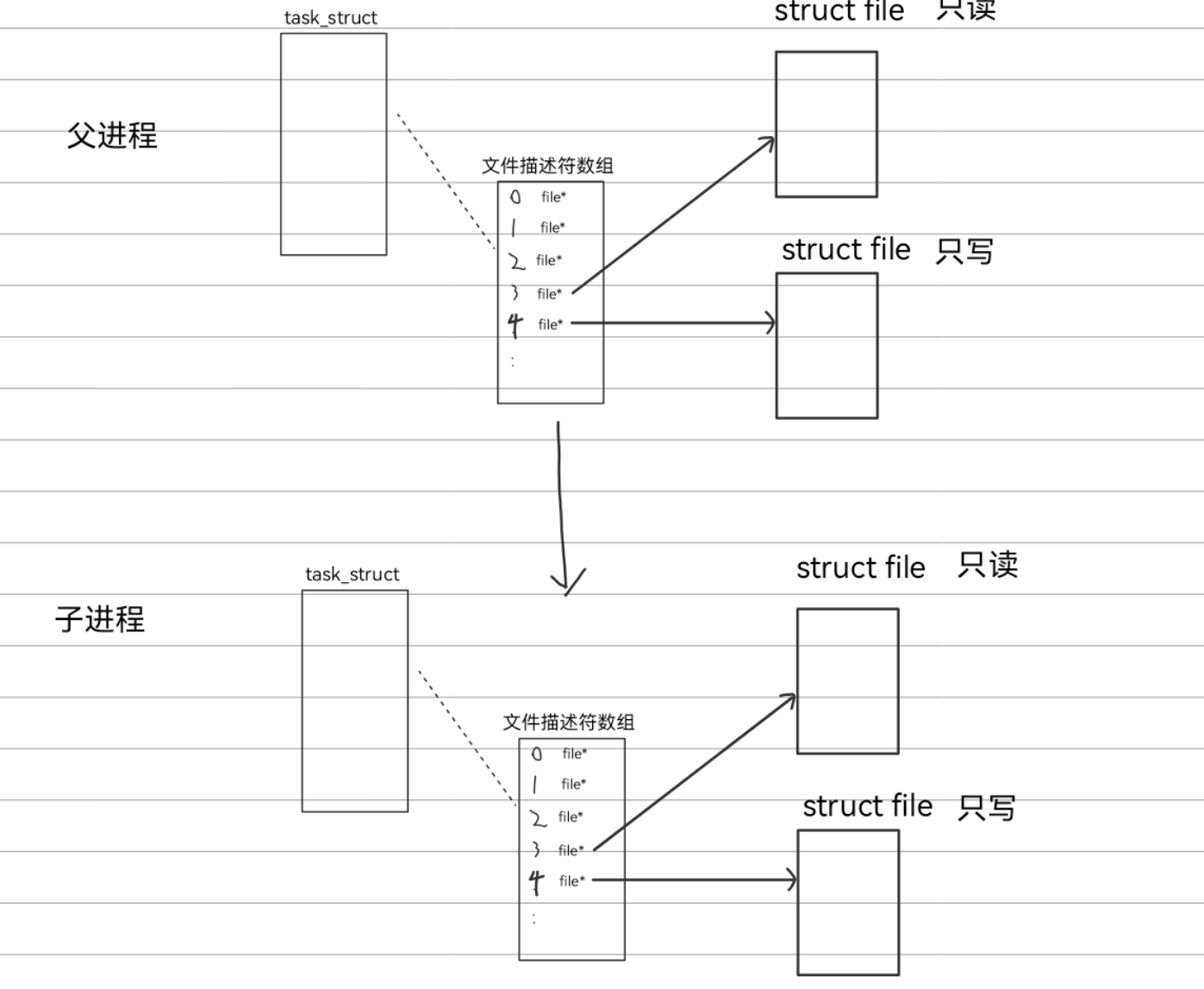 我们先让父进程分别创建对管道文件拥有只读和只写权限的两个file结构体,然后让子进程不仅仅继承进程管理结构体,也写实拷贝上文件描述符数组中指向的两个file结构体