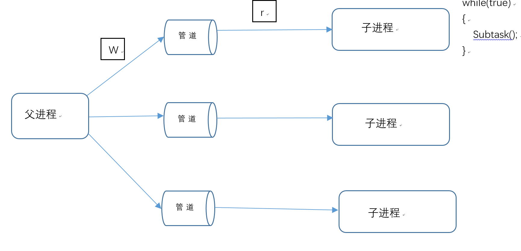 cpp#include "ProcessPool.hpp" //父->子 int main() { for (int i = 1; i <= gdefault_process_num; i++) { // 创建管道文件 int pipefd[2] = {0}; int n = pipe(pipefd); if (n == 0) { // 创建子进程 // 关闭父子进程需要关闭的fd pid_t id = fork(); if (id == 0) // 子进程 { close(pipefd[1]); exit(0); } else if (id > 0) // 父进程 { close(pipefd[0]); } } } return 0; }对于单次信道创建,都是创建管道文件->创建子进程->父子进程关闭对应fd