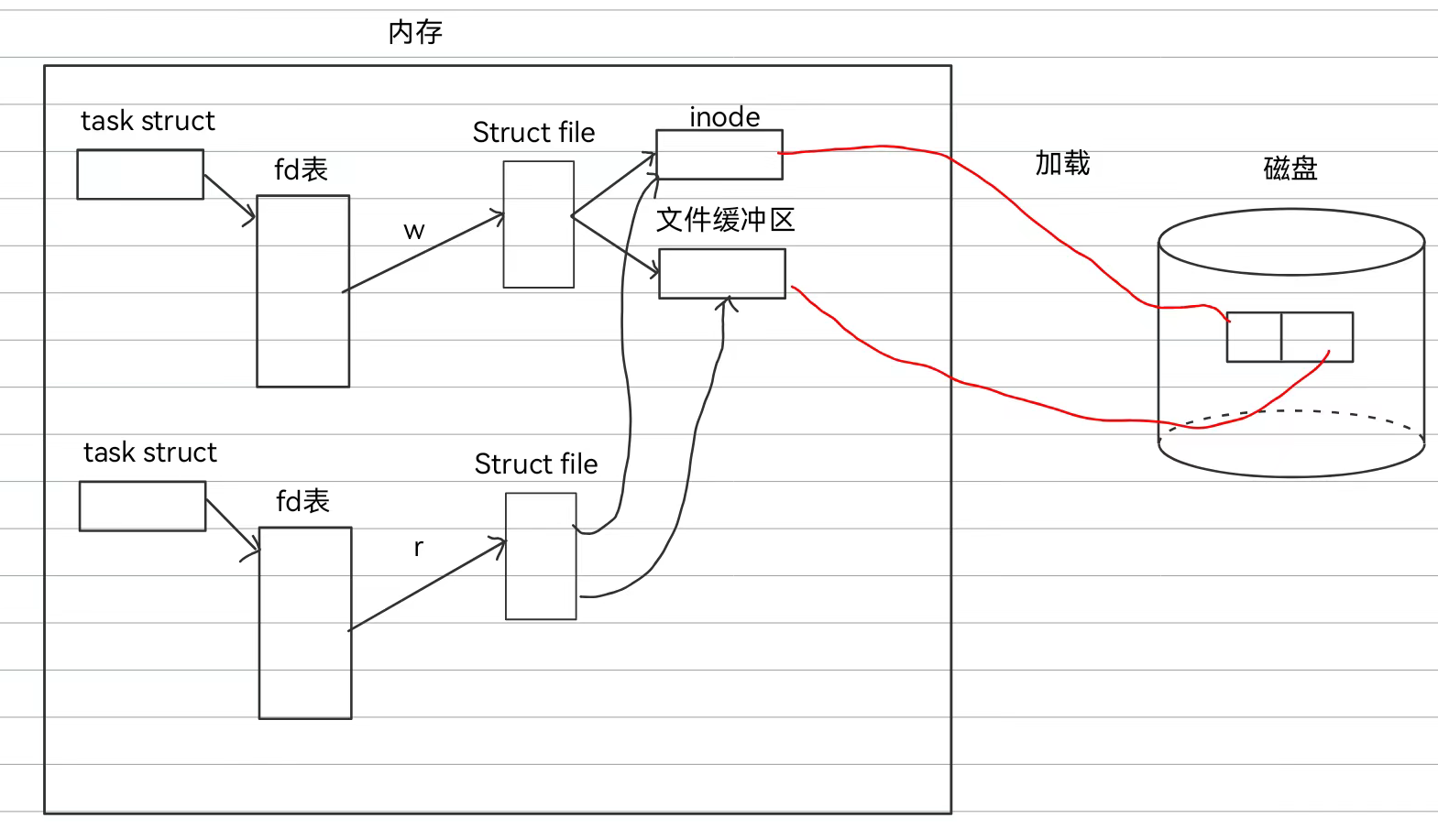首先我们的命名管道文件是存储在磁盘中的,将其文件属性和文件数据分别加载到内存中,进程1就用写端fd指向file(写权限),进程2就用读端fd指向file(读权限),然后两个进程就看到了同一份资源,从而可以实现通信