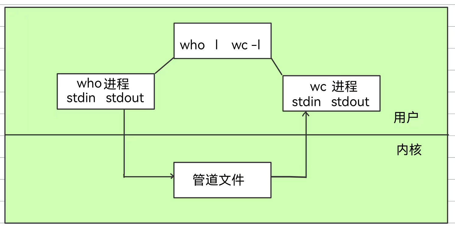 首先who进程会将标准输出流文件改为管道文件,所以who的命令输出给了管道文件,然后wc进程的标准输入文件改为管道文件,也就是wc读取的是管道文件数据,进行wc命令后将结果输出到显示器上