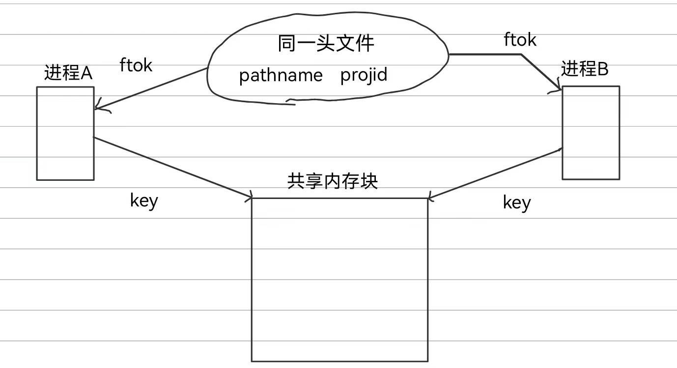 键值key是根据文件名和项目id共同计算得到的,只要让两个进程共同包含的头文件中约定好文件名和项目id,然后进程AB各自利用这些信息就可以计算出唯一的key值
