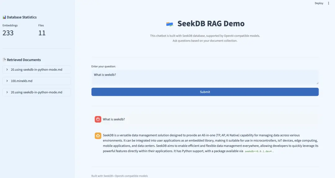 以下是一个真实的查询示例,展示了 seekdb RAG 系统的实际效果: