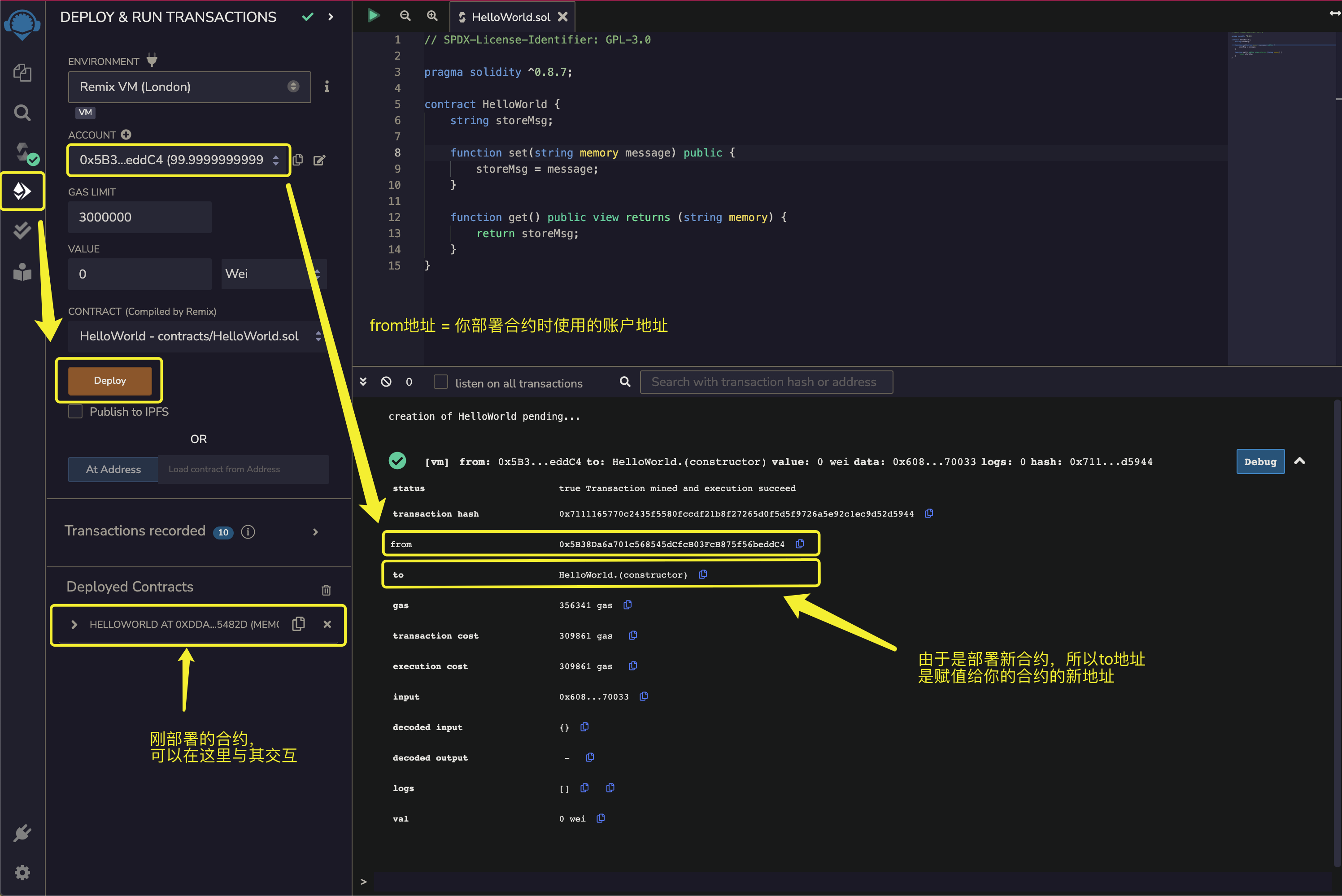 根据之前的教程,使用 Remix IDE 进行编译后,我们将进入"Deploy & Run Transactions"面板,点击"Deploy"按钮进行部署。部署完成后,我们可以在"Terminal"面板和"Deployed Contract"窗口中看到新的记录出现。