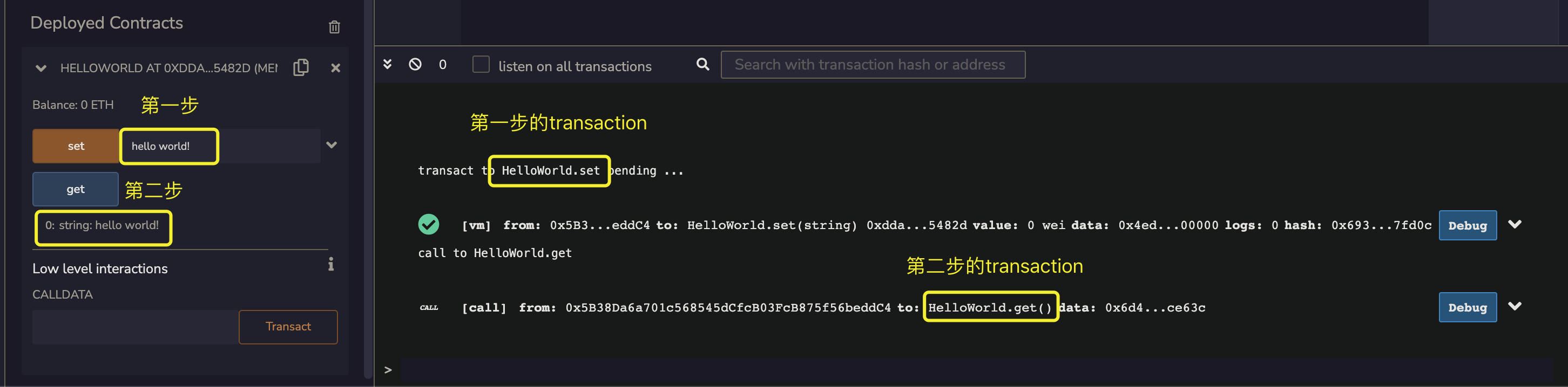 如下图所示,我们通过两个步骤与合约进行交互,并执行了两笔交易,每笔交易都需支付相应的 Gas 费用: