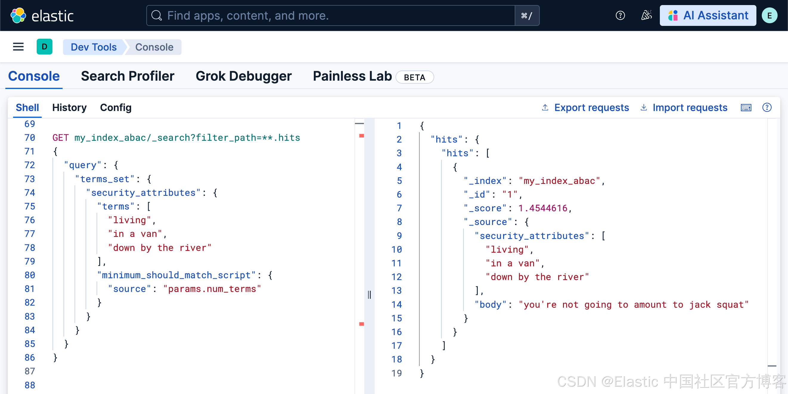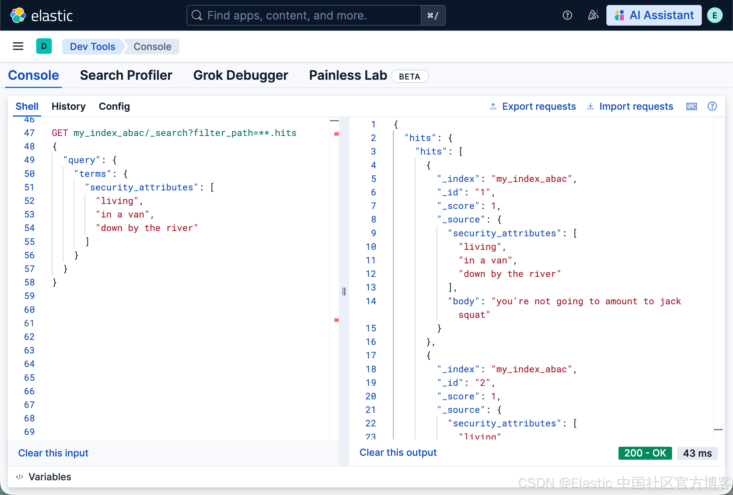 ...是的,解码这个角色模板查询就像在看《黑客帝国》(关于为什么会这样以及如何解决的提议可见此 issue),但它本质上与上面的 terms_set 查询相同。唯一的区别是使用了 {{_user.metadata.security_attributes}} Mustache 模板来替代硬编码的属性列表。需要明确的是,通过从用户元数据中添加这些安全属性,我们使得该角色在每个用户发出的查询中应用了用户特定的属性:即基于属性的访问控制查询。