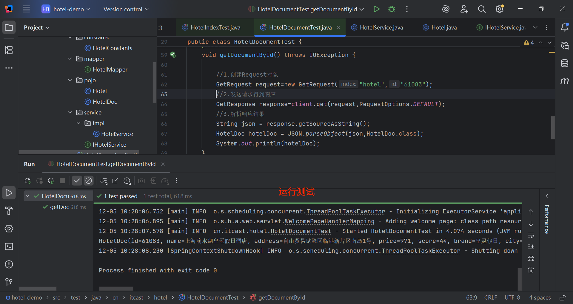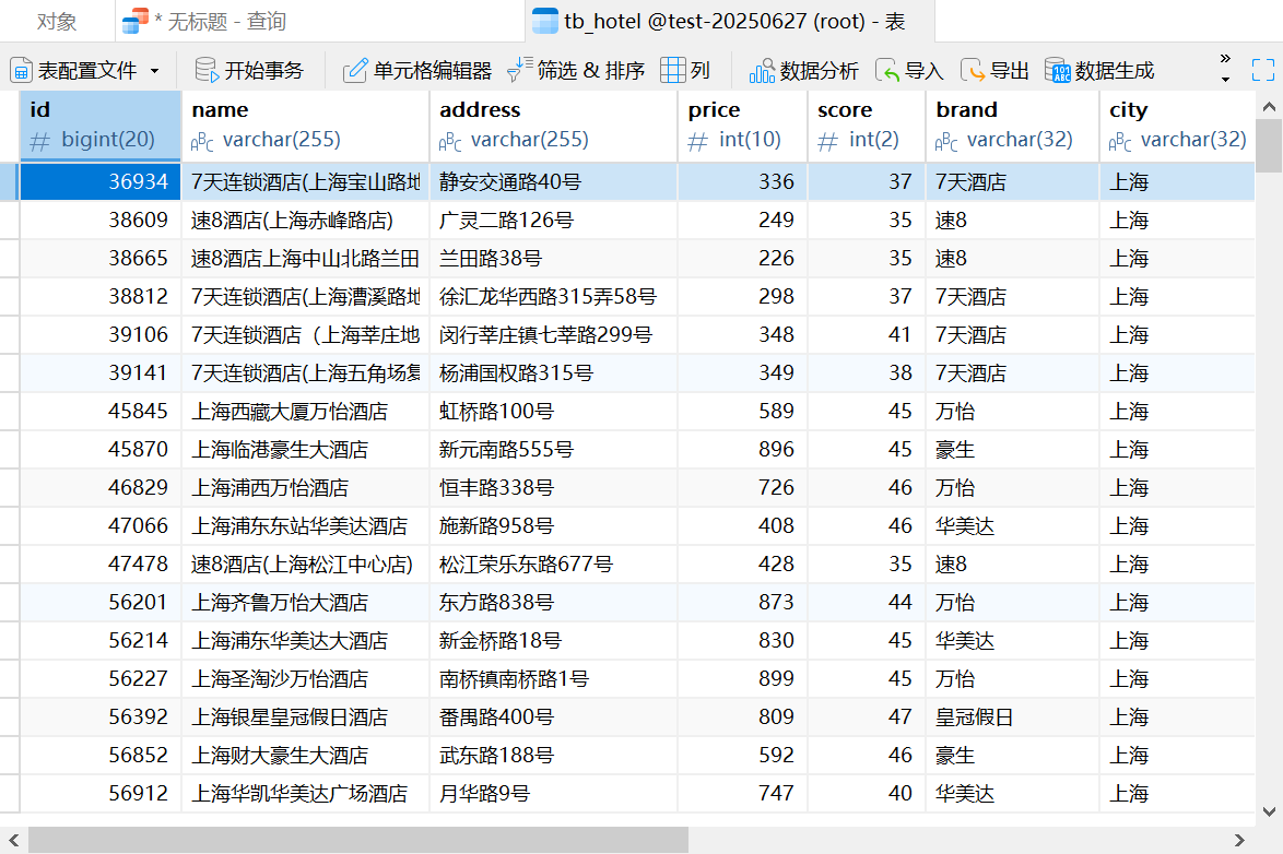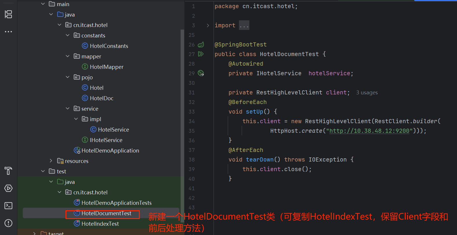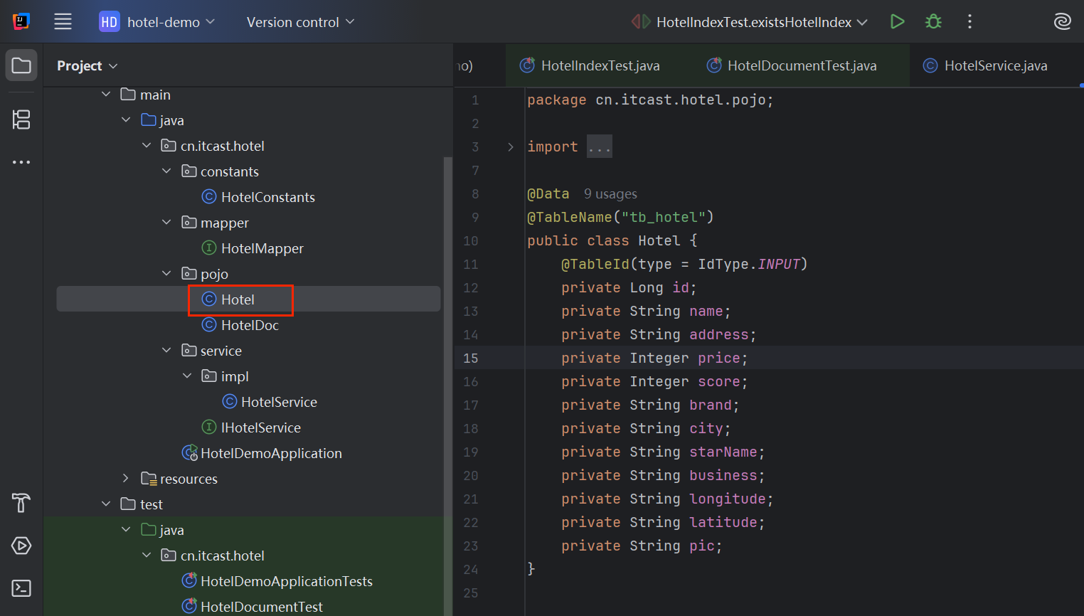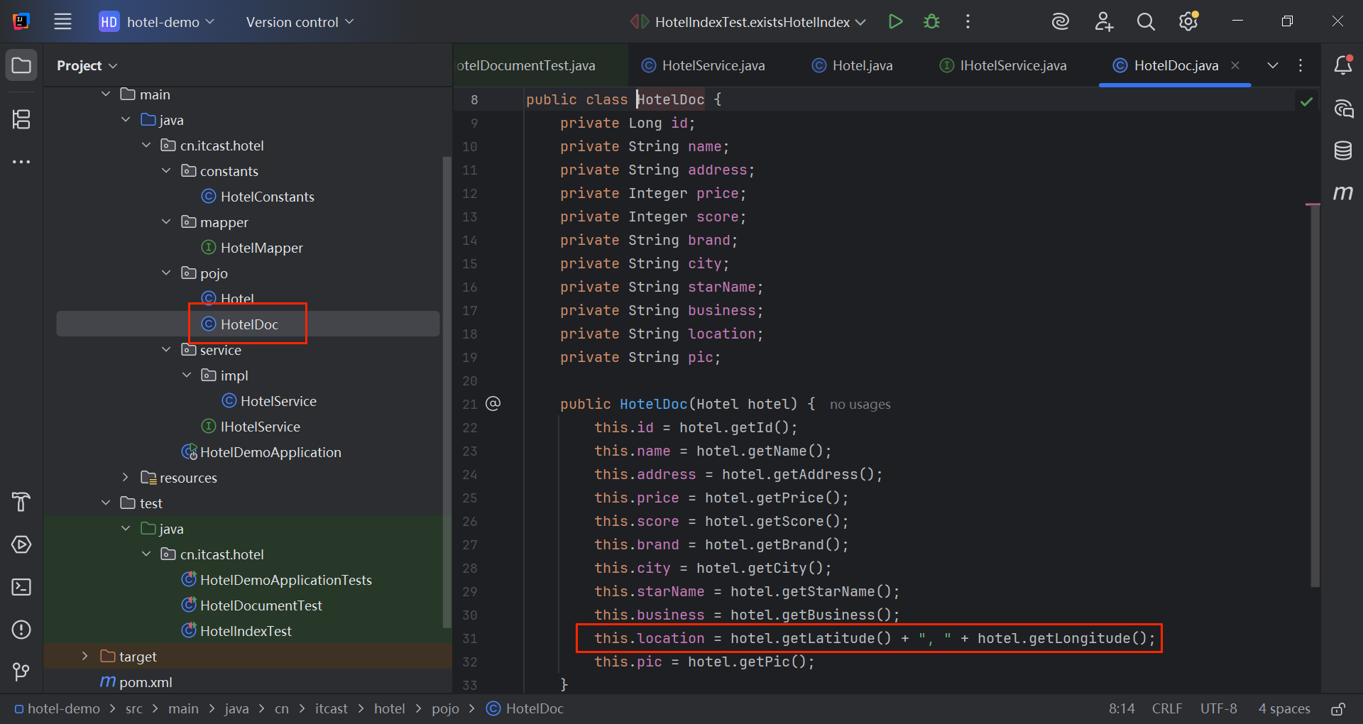 还需要注意一个问题,前面在elastic中创建Hotel索引库时,里面的字段和MySQL数据库中表的字段不完全一致,longitude和latitude合成了location。为了方便,可以再建议一个HotelDoc.java来进行转换: