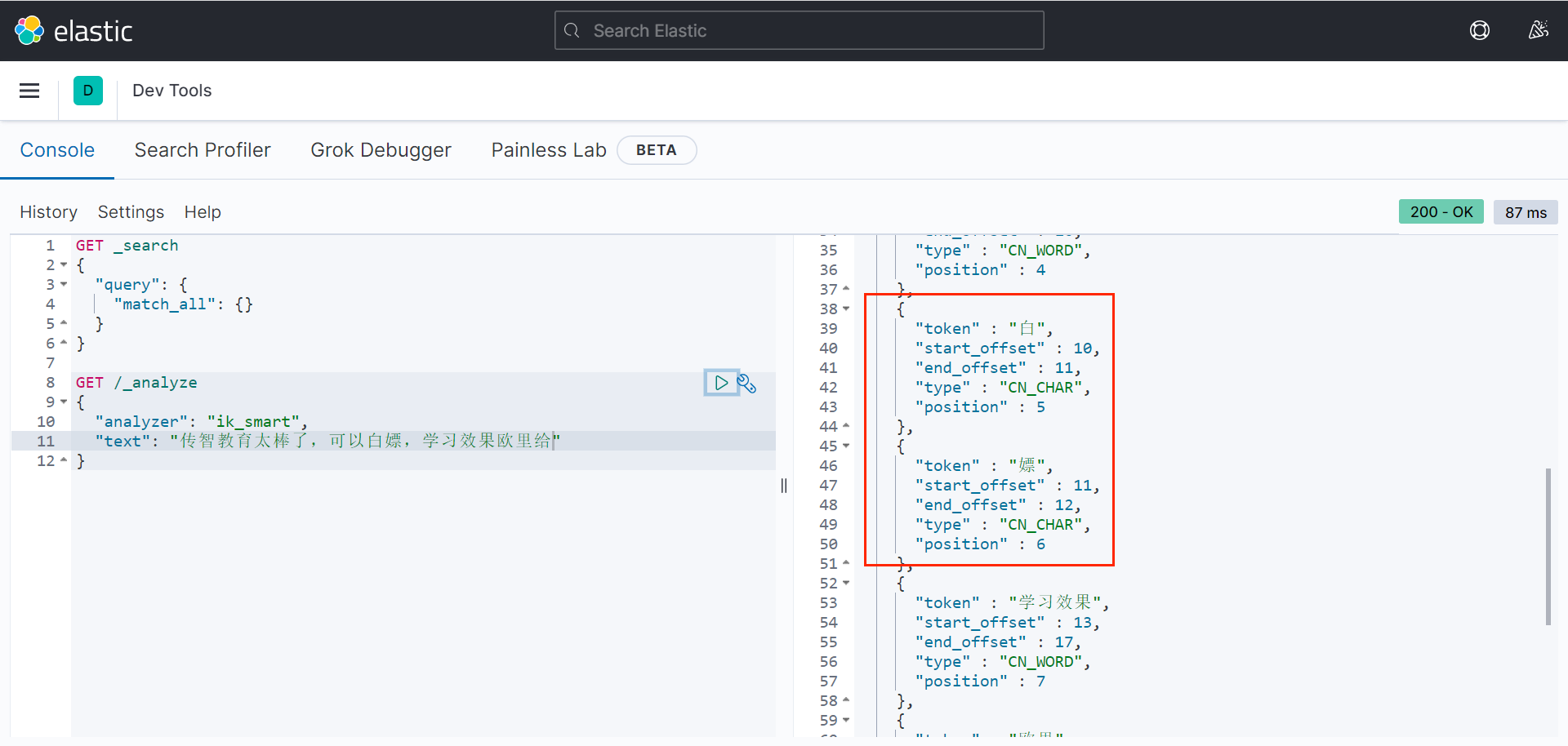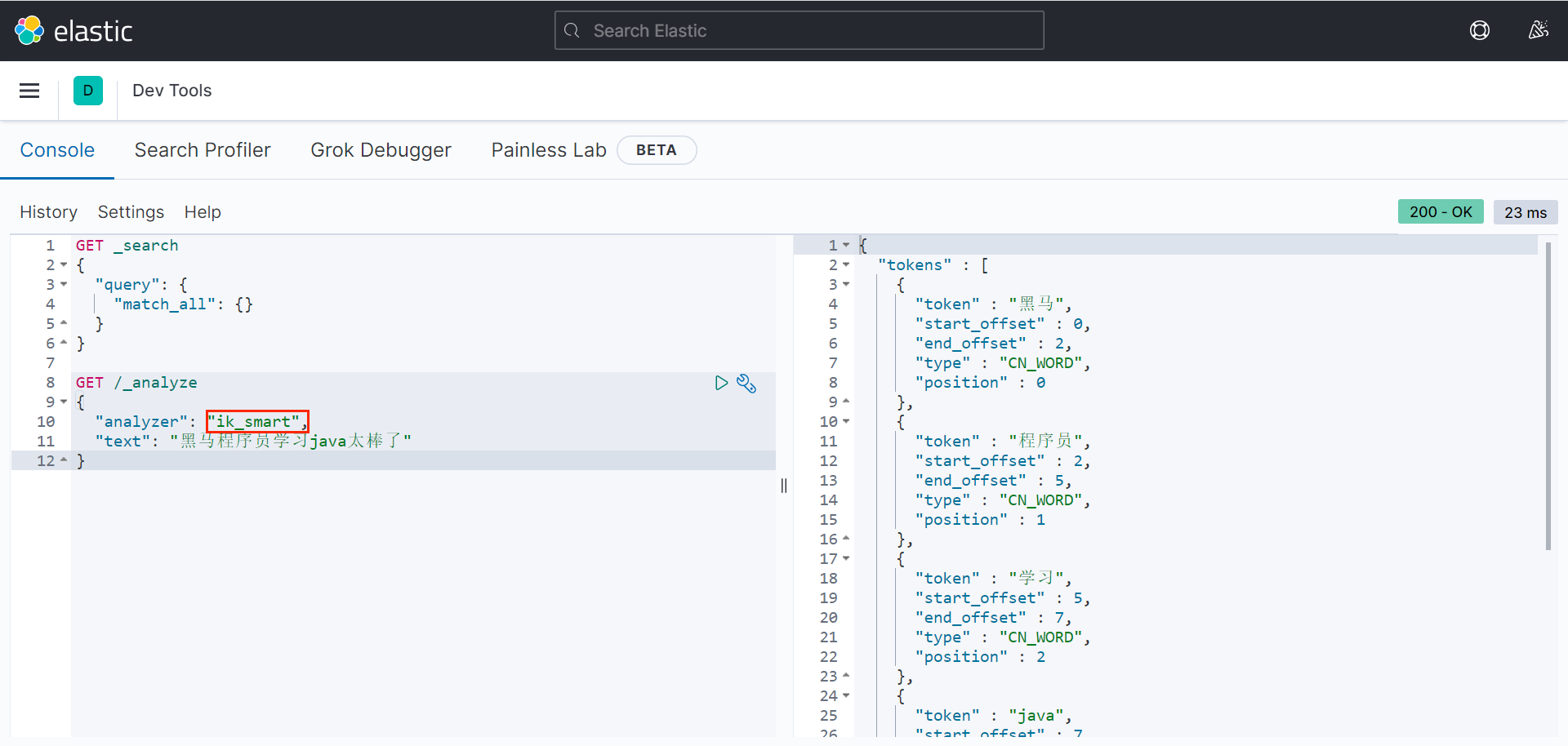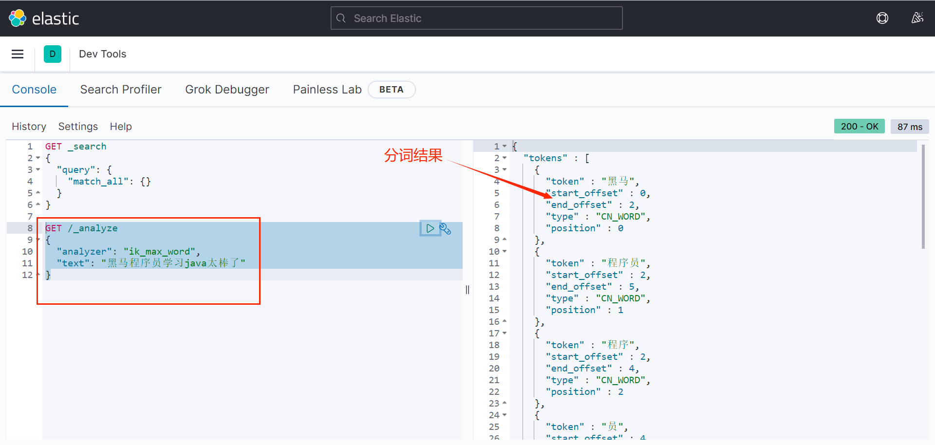 GET /_analyze { "analyzer": "ik_max_word", "text": "黑马程序员学习java太棒了" }