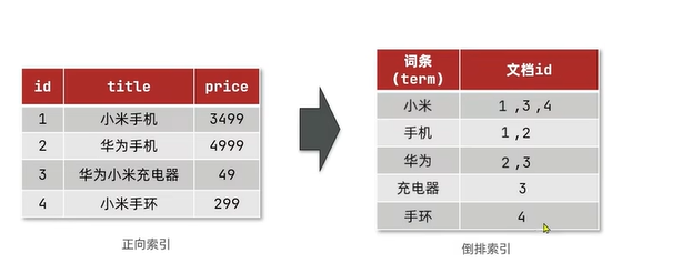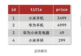 传统数据库(如MySQL)采用正向索引,例如给tb_goods表的字段id创建索引,而对于没加索引的字段title,根据该字段查询时需要遍历所有记录。