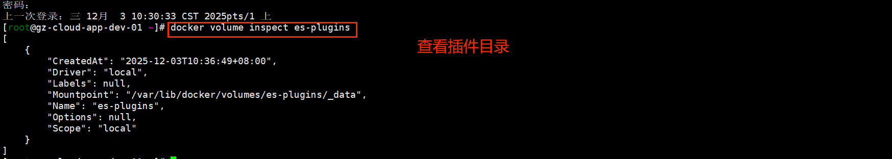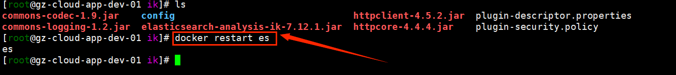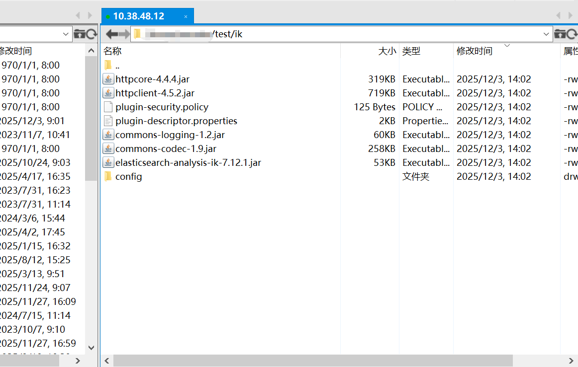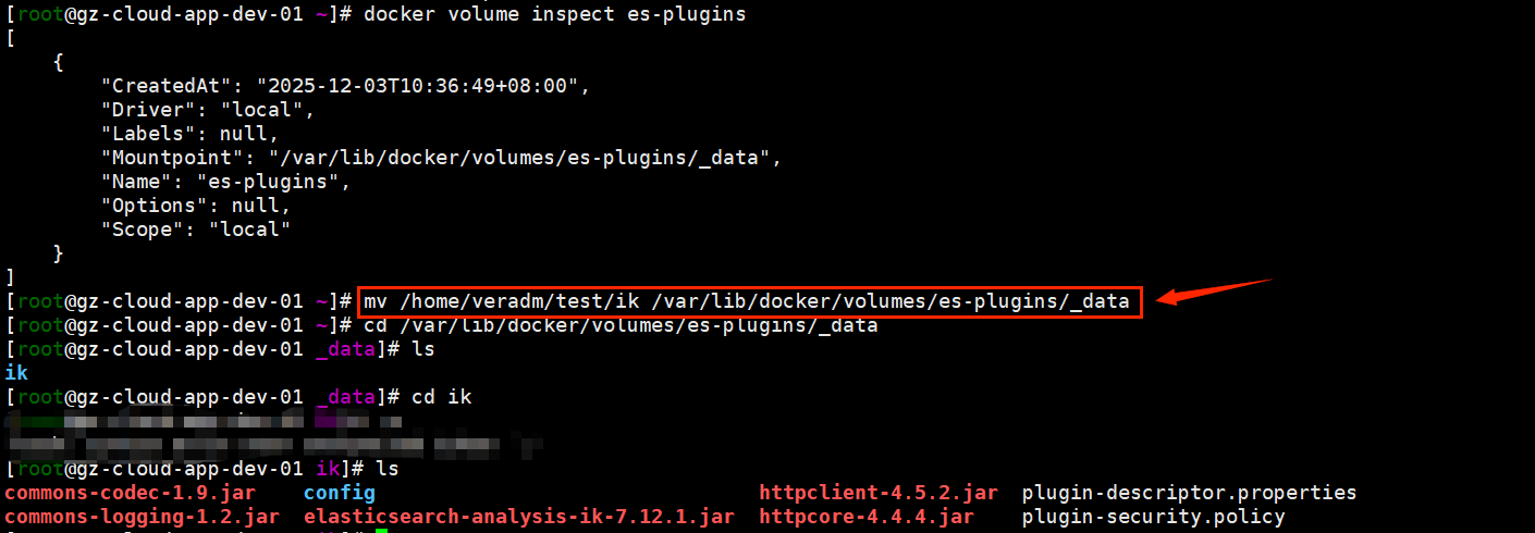 将解压的ik文件夹里的东西上传到查询到的插件目录/var/lib/docker/volumes/es-plugins/_data。直接上传可能打不开这个目录,可以先上传到一个目录再用mv指令。