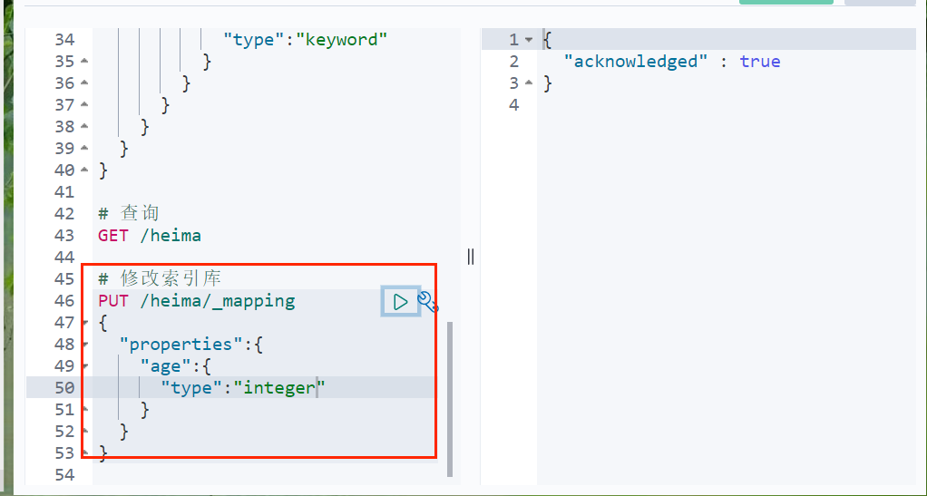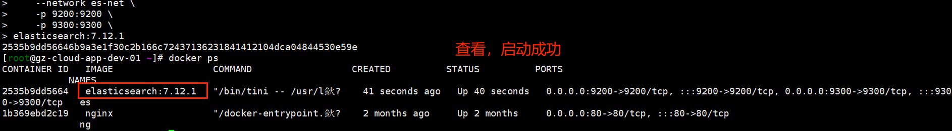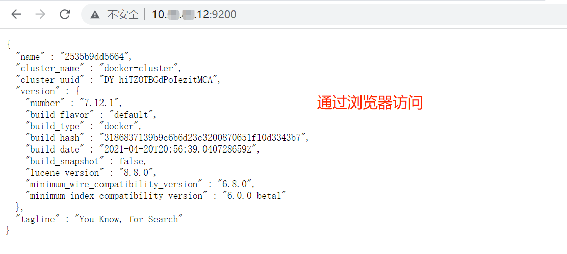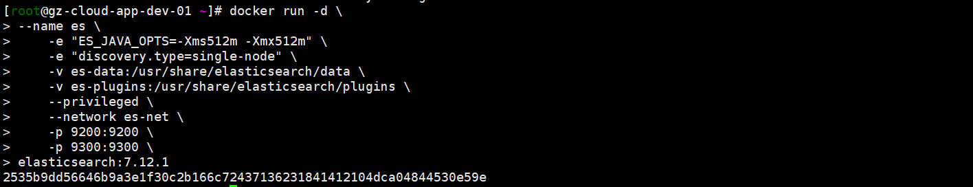 -e "cluster.name=es-docker-cluster":设置集群名称-e "http.host=0.0.0.0":监听的地址,可以外网访问-e "ES_JAVA_OPTS=-Xms512m -Xmx512m":内存大小-e "discovery.type=single-node":非集群模式-v es-data:/usr/share/elasticsearch/data:挂载逻辑卷,绑定es的数据目录-v es-logs:/usr/share/elasticsearch/logs:挂载逻辑卷,绑定es的日志目录-v es-plugins:/usr/share/elasticsearch/plugins:挂载逻辑卷,绑定es的插件目录--privileged:授予逻辑卷访问权--network es-net:加入一个名为es-net的网络中-p 9200:9200:端口映射配置