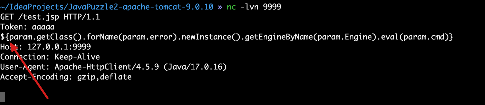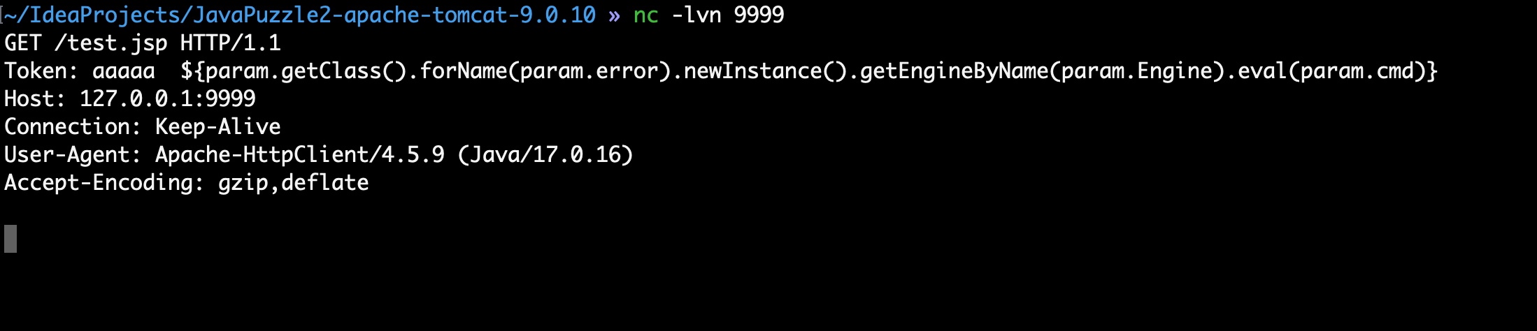 开始排错,本地nc监听 9999 端口,请求 url 改为 9999 端口,可以看到 Token 头并未换行成功,因此直接 url编码\n无法实现换成。