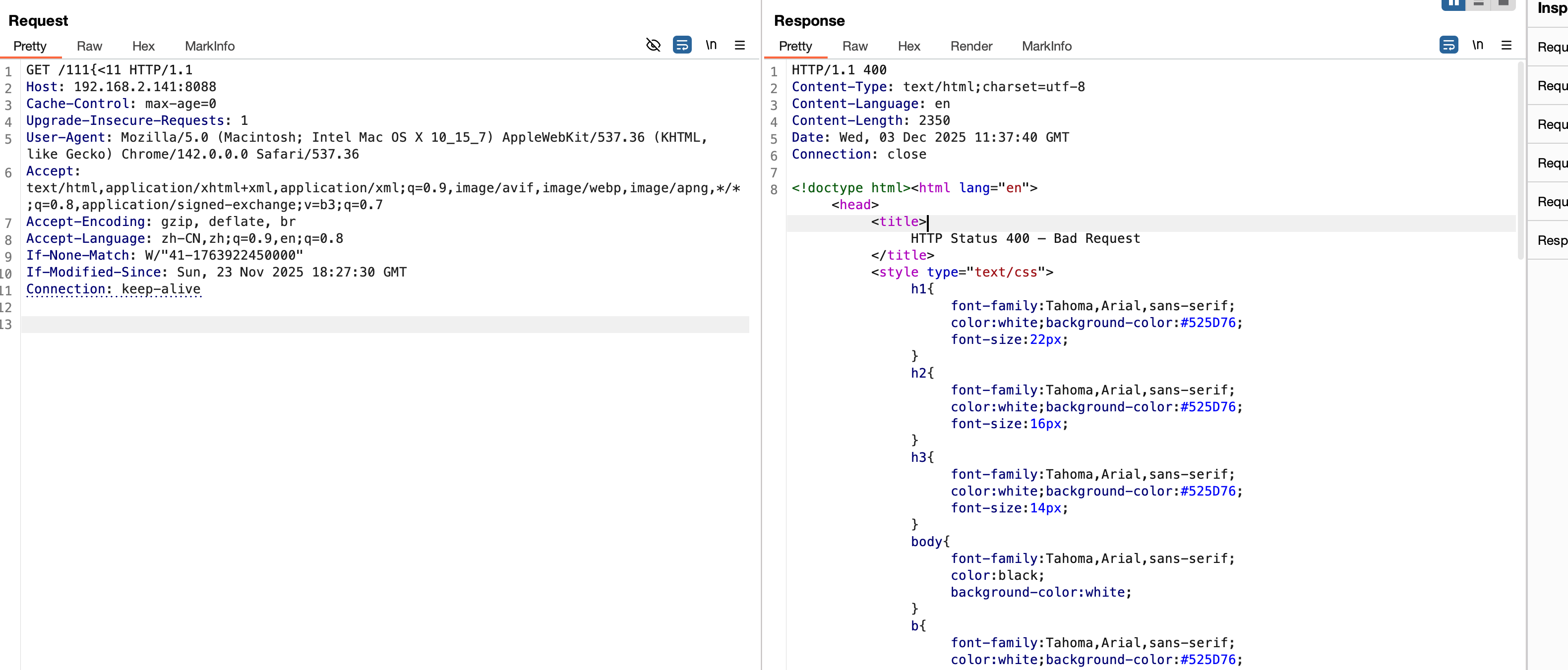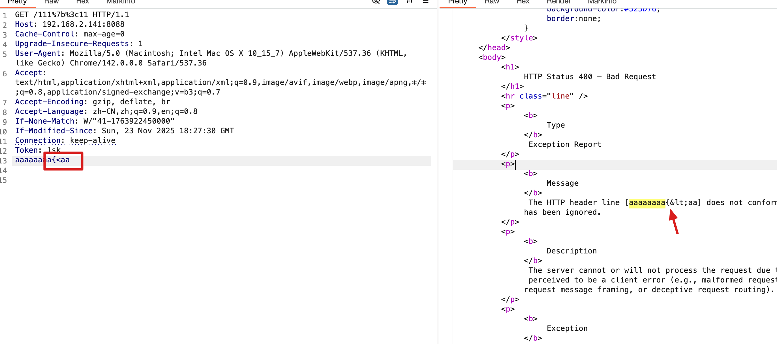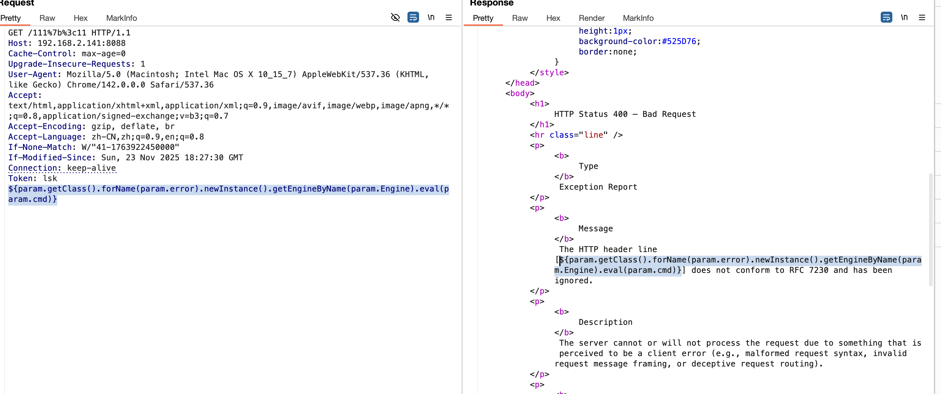请求 url 是可以报错回显的,但是不支持 { < 这类 webshell 所必须的符号,直接报错 400,不回显内容,因此只能发从Token 头入手,想办法让 Token 的值可以回显到页面中。