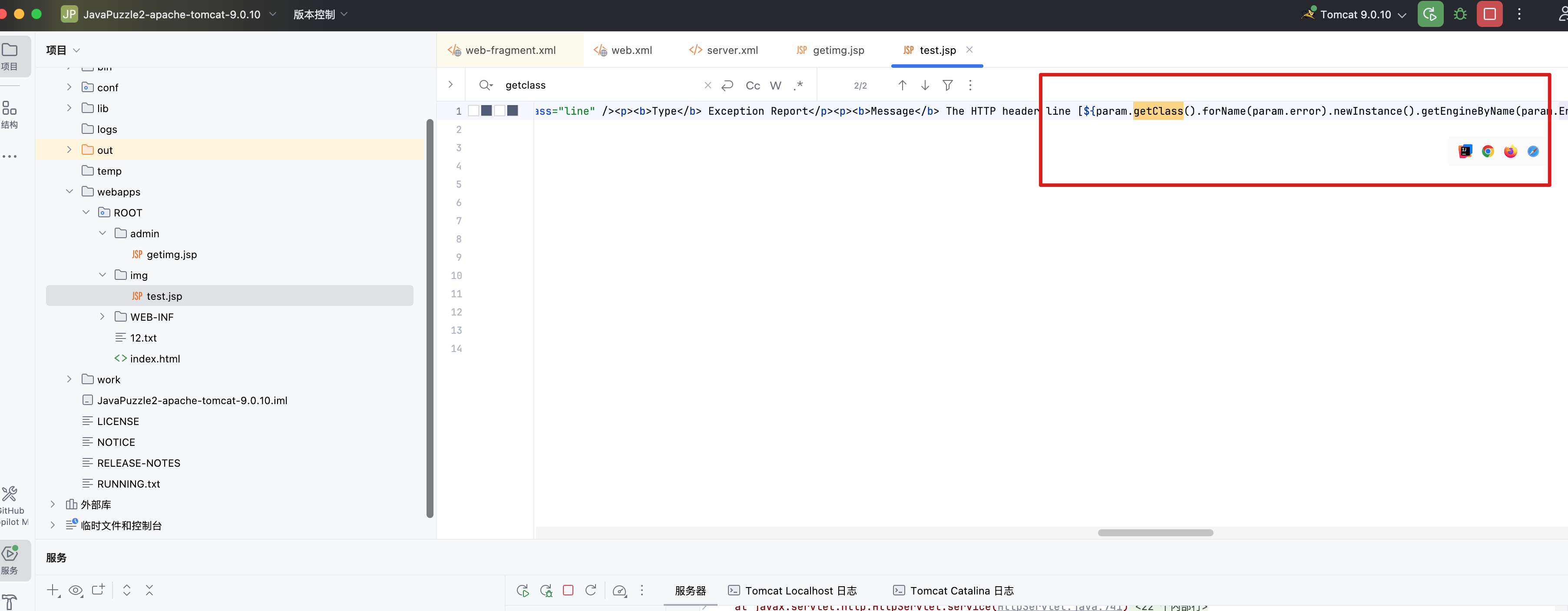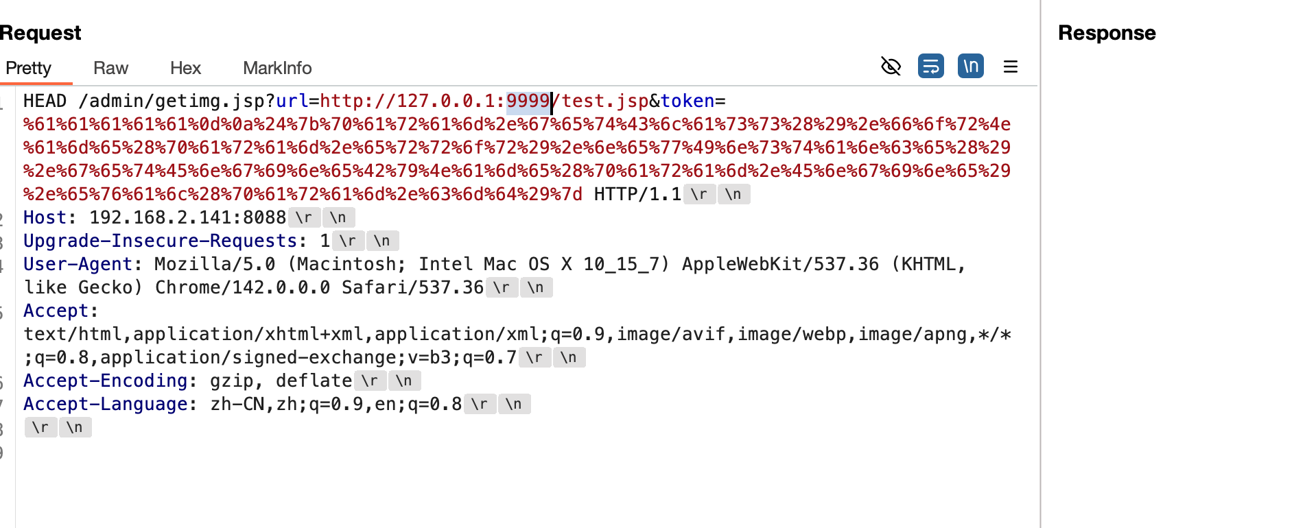 因此思路为利用该应用报错回显来写入 webshell,url 参数可以指定当前应用 url,想办法让请求的报错达到在返回包自定义 webshell 内容的目的,因为 getimg.jsp会把响应包的内容写入到 url 最后一个 / 之后定义的文件名中。