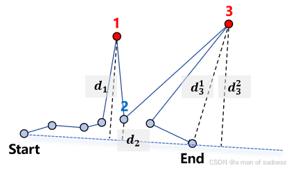 - 对于起终点之间的所有点,计算点到直线的距离并确定最大距离