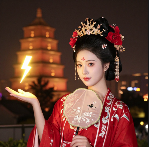 prompt = "Young Chinese woman in red Hanfu, intricate embroidery. Impeccable makeup, red floral forehead pattern. Elaborate high bun, golden phoenix headdress, red flowers, beads. Holds round folding fan with lady, trees, bird. Neon lightning-bolt lamp (⚡️), bright yellow glow, above extended left palm. Soft-lit outdoor night background, silhouetted tiered pagoda (西安大雁塔), blurred colorful distant lights."