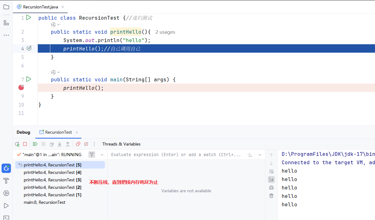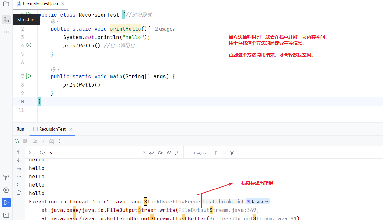 结论:每一次方法调用都会有入栈,调用结束都会出栈。如果同一个方法调用多次,就会入栈多次,出栈多次。栈结构遵循先进后出的原则。