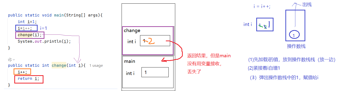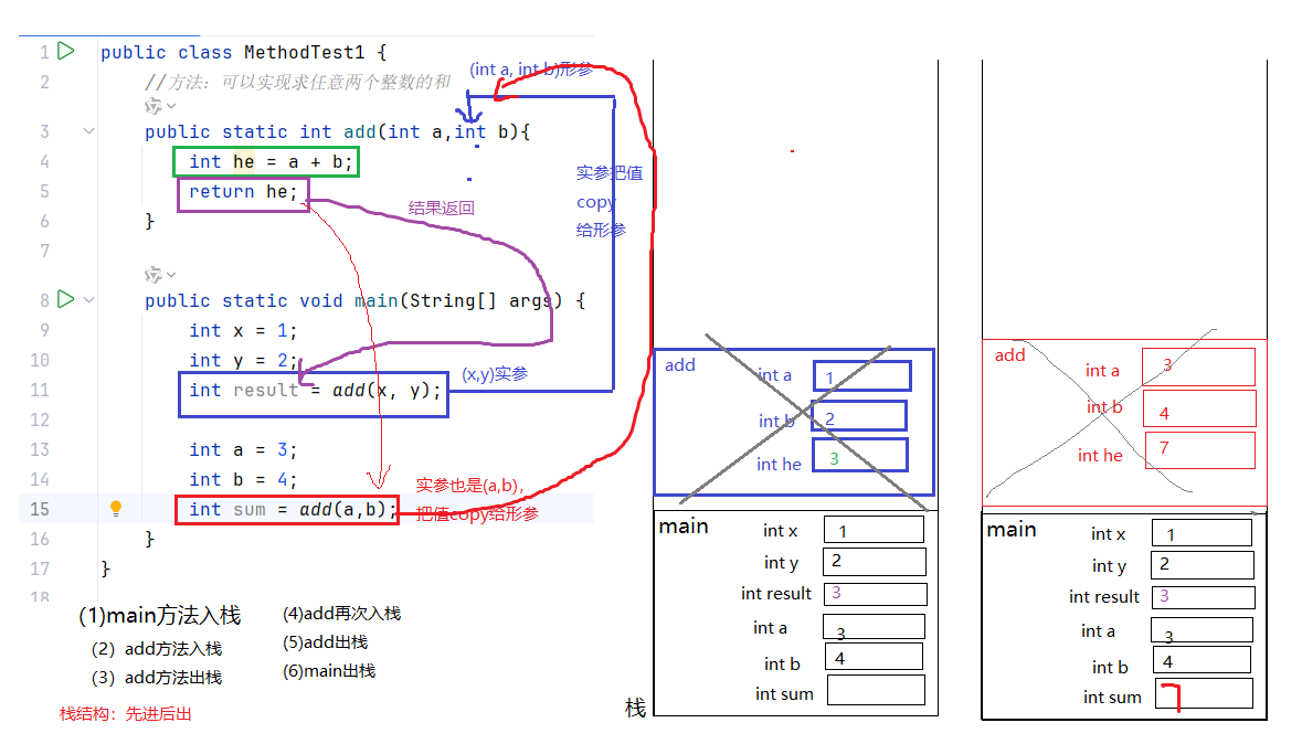 方法一次调用结束会释放它占用的栈内存空间,这个动作称为"出栈"。如果有返回值,会将结果返回到调用处。