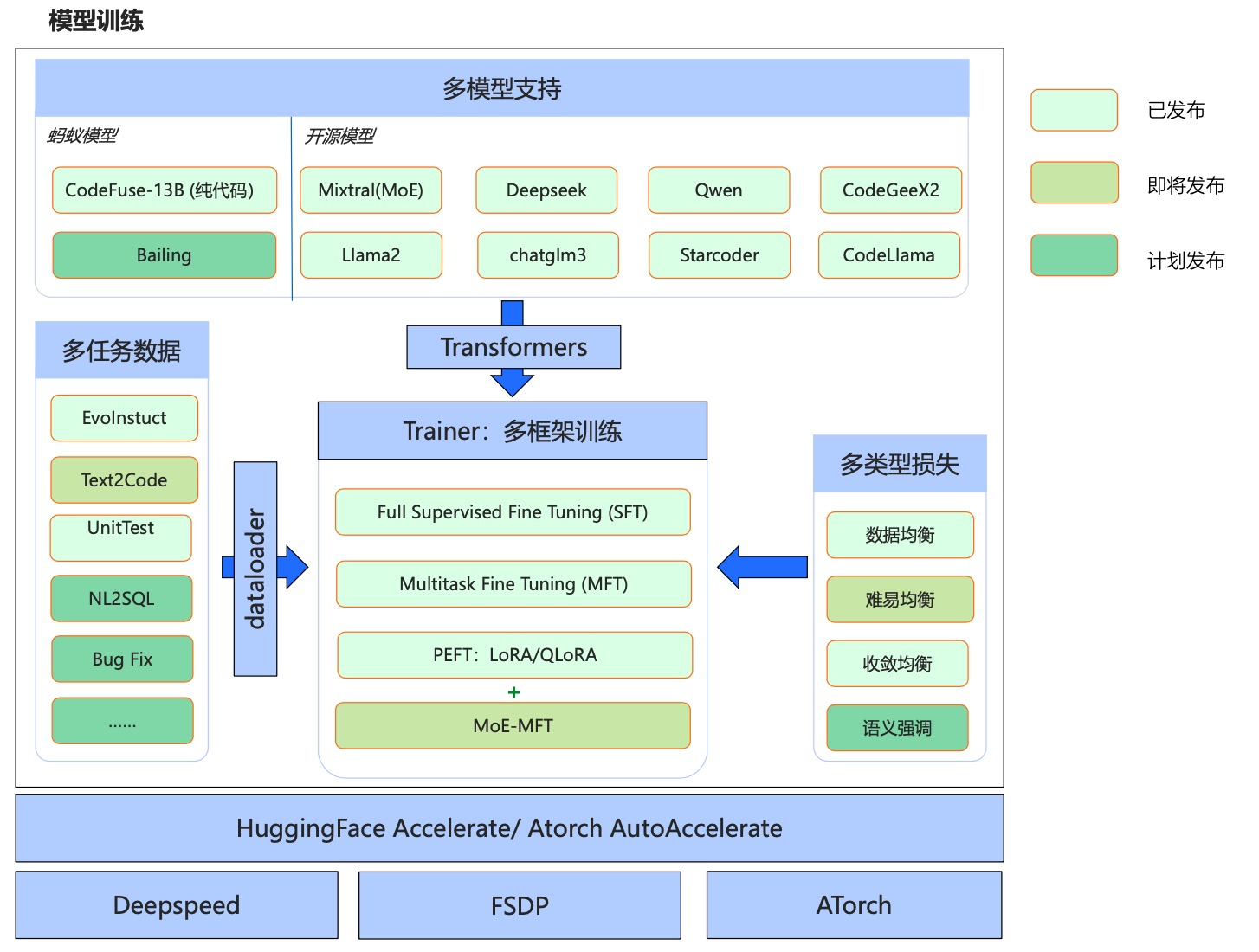 - 多框架:支持主流开源的Accelerate、DeepSpeed、FSDP、ATorch框架;