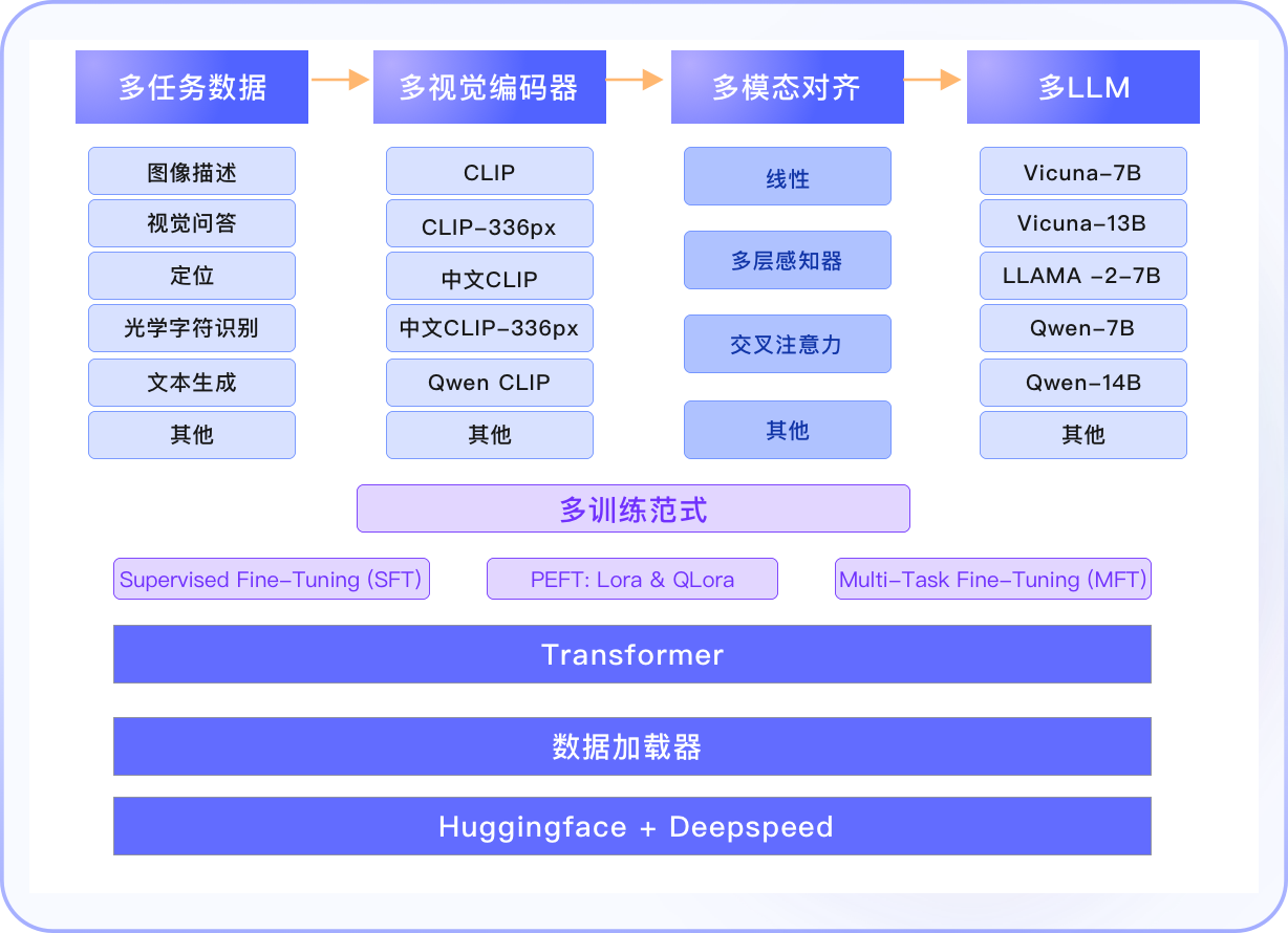 开源(GitHub,40 Star,9 Fork)为多模态LLM设计的框架,旨在兼容和适应多种视觉和语言模型以支持不同类型的任务。集成众多视觉编码器如CLIP系列,LM如Vicuna和LLAMA系列,提供灵活的配置选项,允许用户通过VL-MFTCoder自由组合不同的模型,从而简化多模态任务的开发和应用过程。