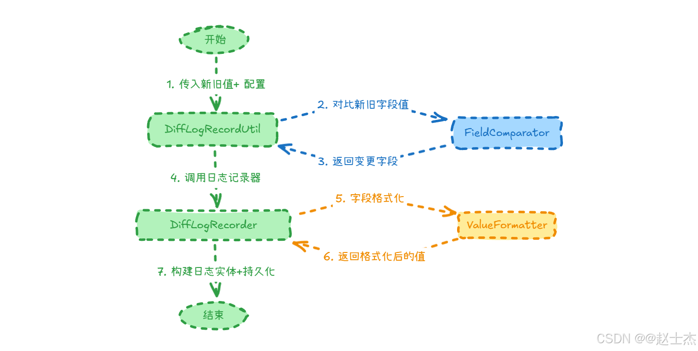 DiffLogRecordUtil添加需要对比的字段,可配置指定对比器、格式化器(可选,默认使用通用实现)。 DiffLogRecordUtil调用比较器FieldComparator,完成新旧字段值的对比,筛选出发生变更的字段。DiffLogRecordUtil携带变更字段信息,调用日志记录器DiffLogRecorder。- 日志记录器