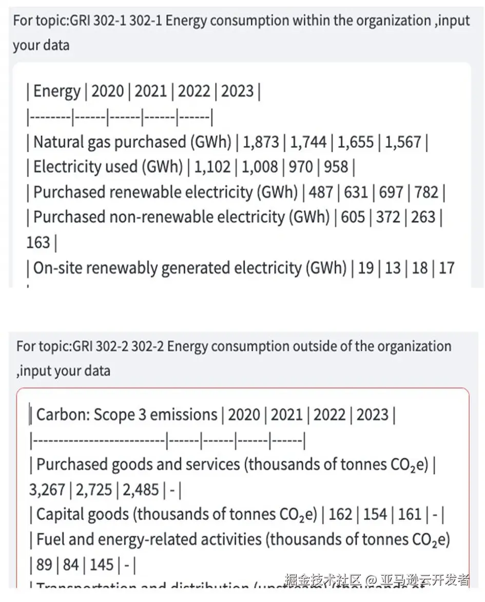 系统接收用户提供的企业ESG相关定量与定性数据,同时通过OpenSearch检索相关标准、最佳实践和历史报告片段,构建丰富的上下文环境。这一步骤确保生成内容符合行业规范且保持企业风格一致性。