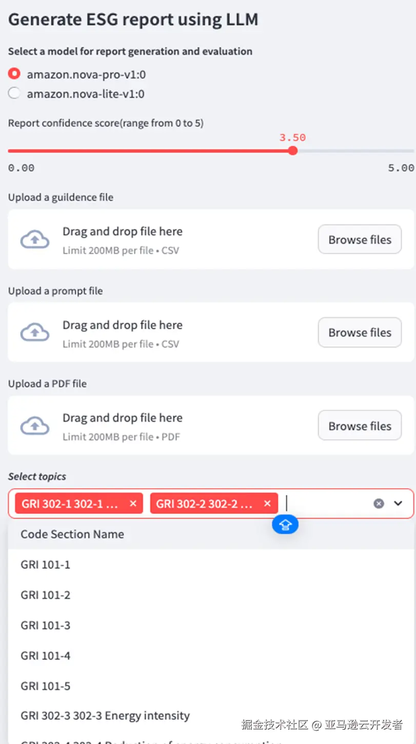 用户通过直观界面选择目标框架、细则项,并设定质量控制参数。系统支持模型切换,便于比较不同LLM在特定ESG主题上的表现差异。