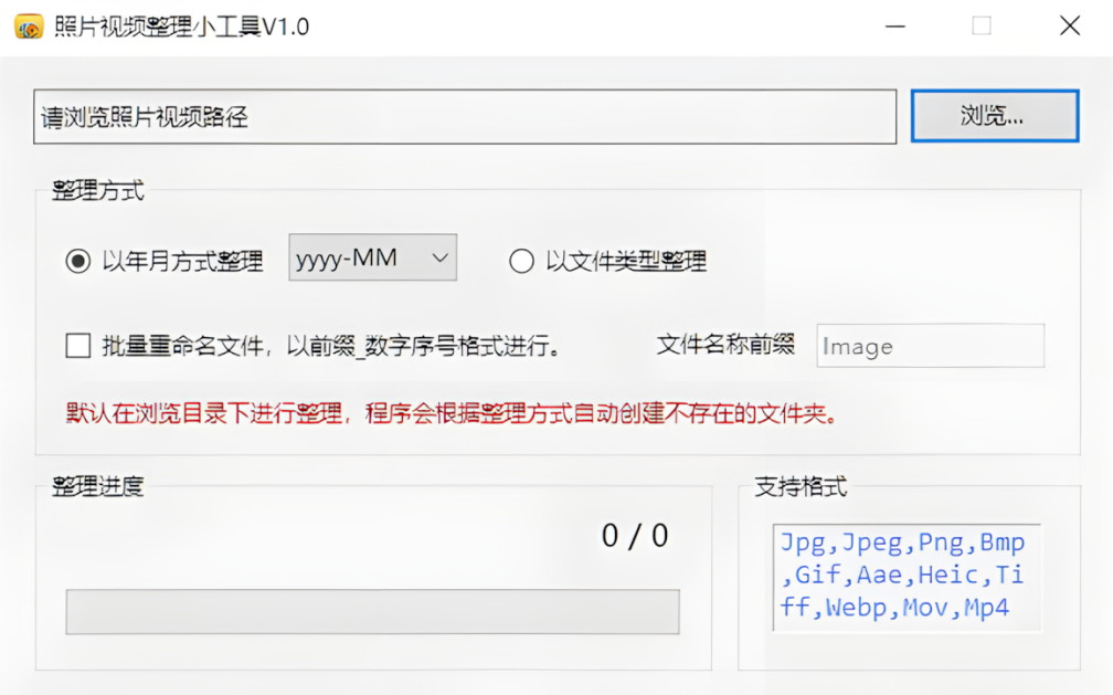 照片视频整理工具 V1.0 是一款专为解决手机照片视频导出后整理繁琐问题设计的实用工具,支持按年月或文件类型自动分类 、批量重命名,帮个人用户和摄影爱好者快速处理大量媒体文件,显著提升文件管理效率。
