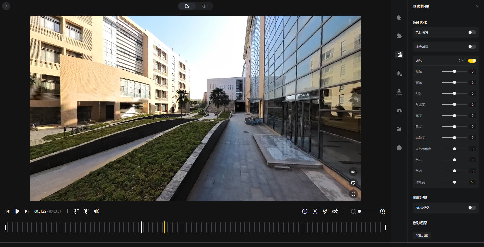 在 insta360 studio 中,进行后期编辑,略微上调清晰度,导出视频。
